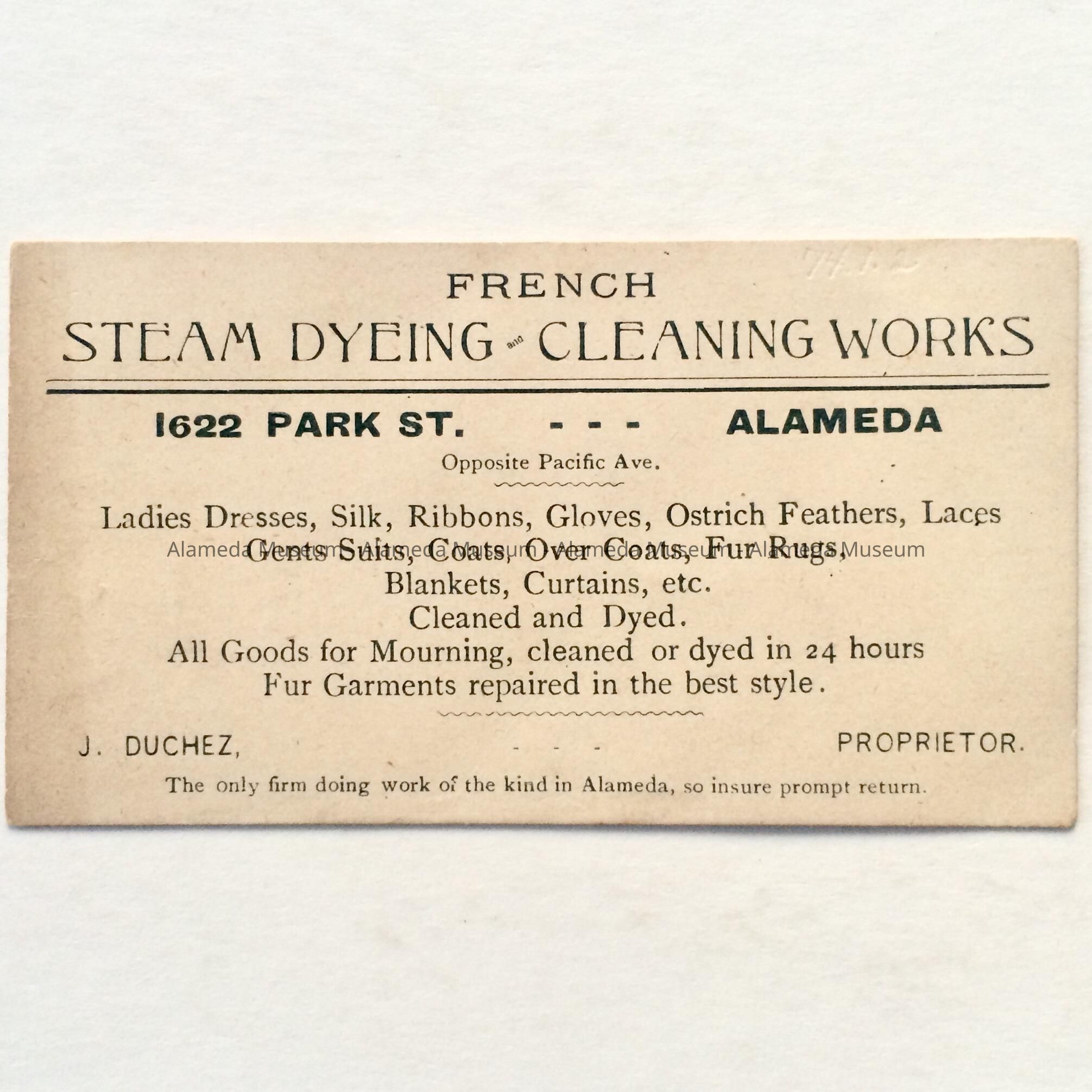 FRENCH STEAM DYEING AND CLEANING WORKS, 1622 PARK ST., OPPOSITE PACIFIC AVENUE. J. DUCHEX, PROPRIETOR.