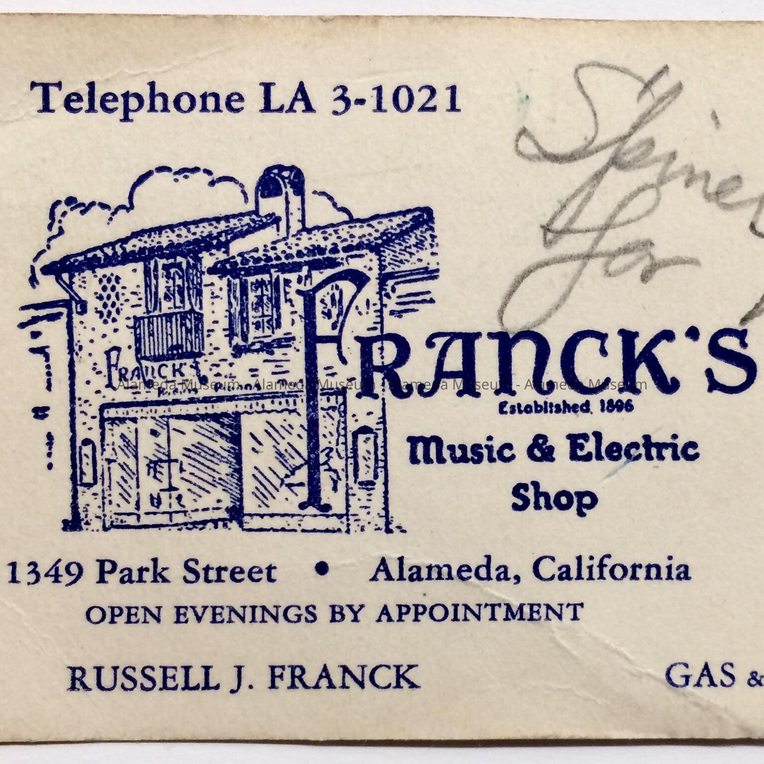History: Business card from Franck's Music and Electric Shop, 1349 Park Street. The business card also includes an illustration of the exterior drawing of their business.