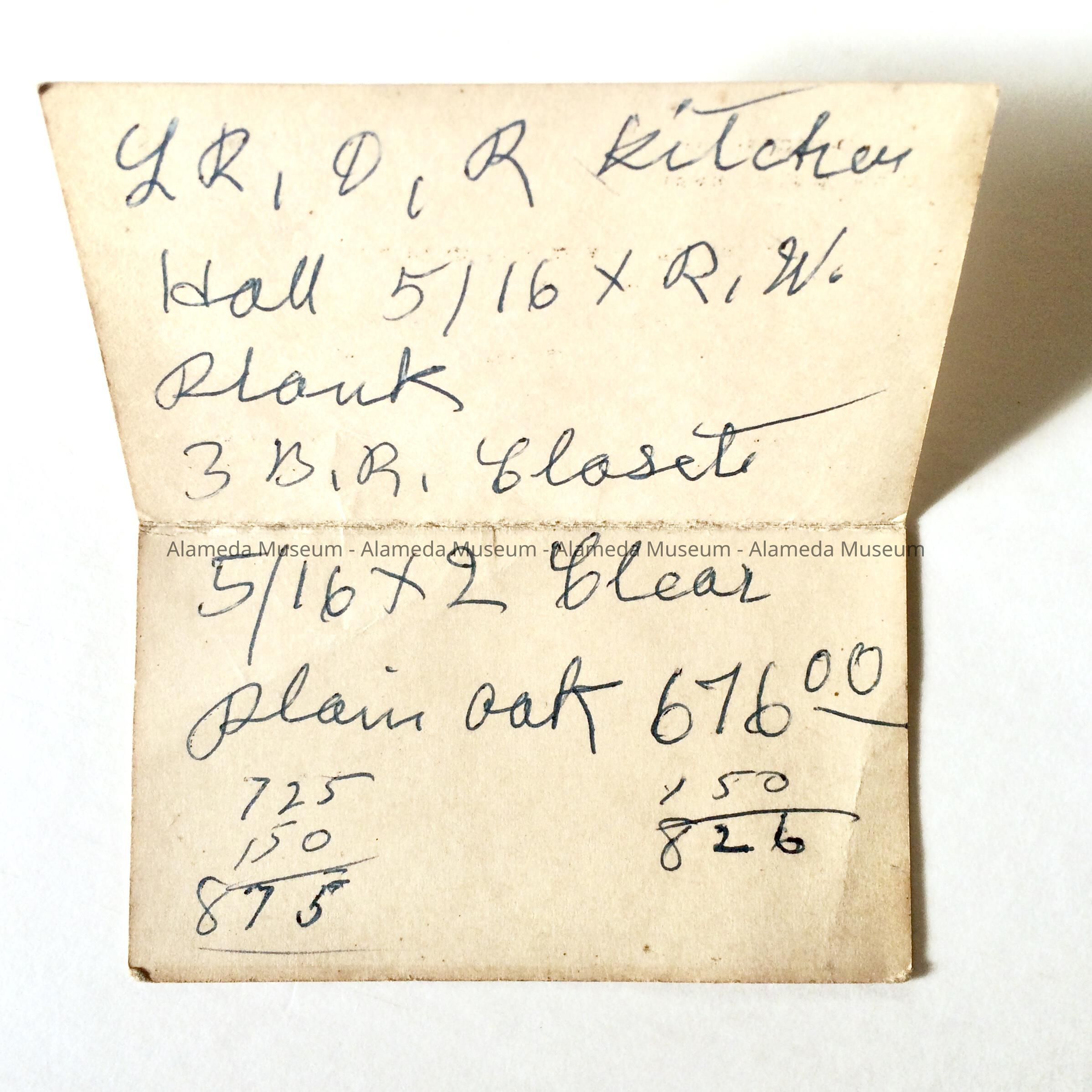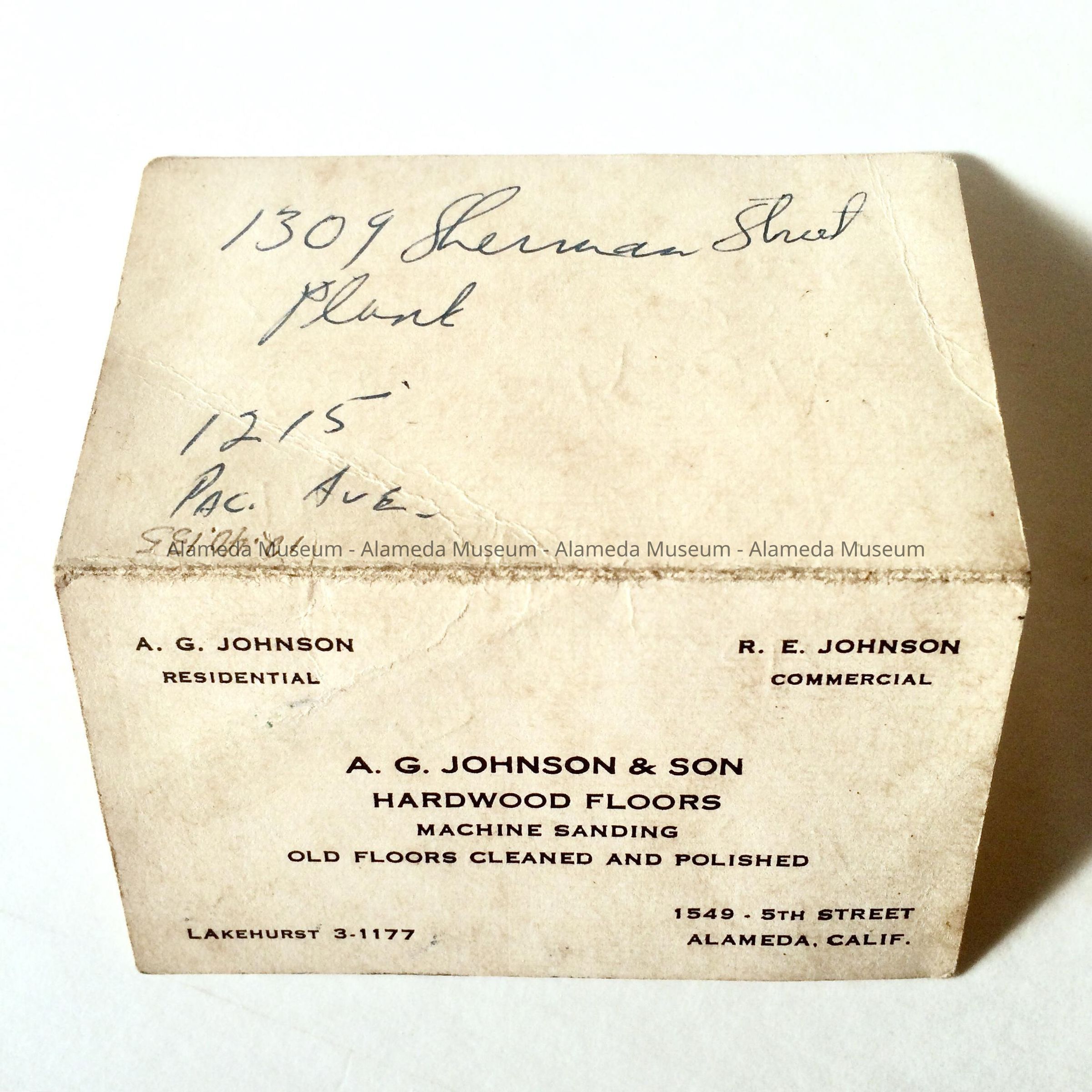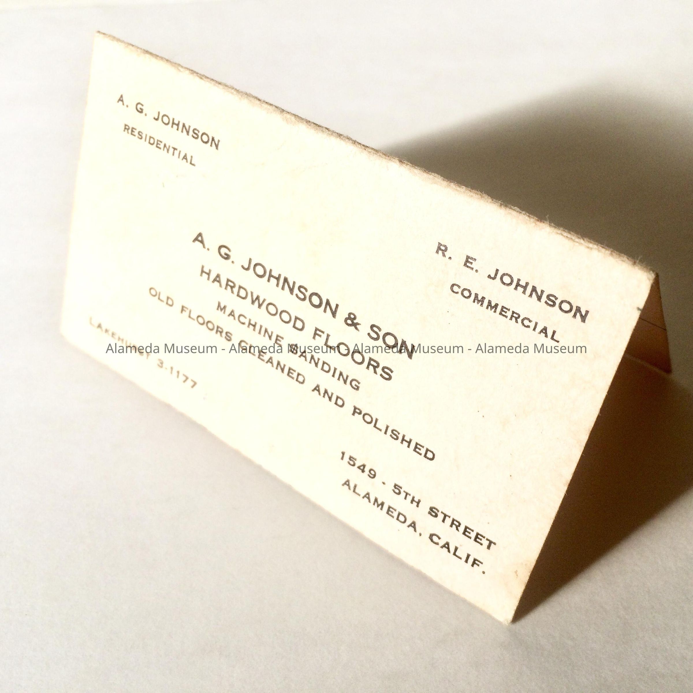 History of Object: Business card for A.G. Johnson and Son, hardwood floor installers, located at 1549 Fifth Street in Alameda, business had a Lakehurst telephone number.