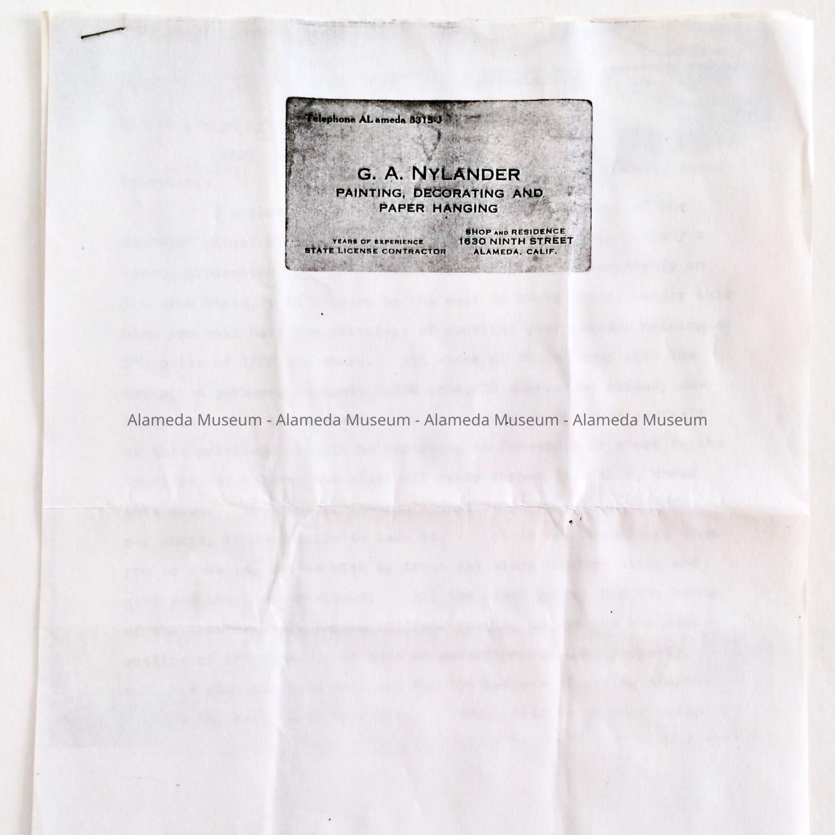 BUSINESS CARD OF C A NYLANDER, PAINTING, DECORATING, AND PAPER HANGING. RESIDENCE AND SHOP WERE LOCATED AT 1630 NINTH STREET, ALAMEDA, CA.
