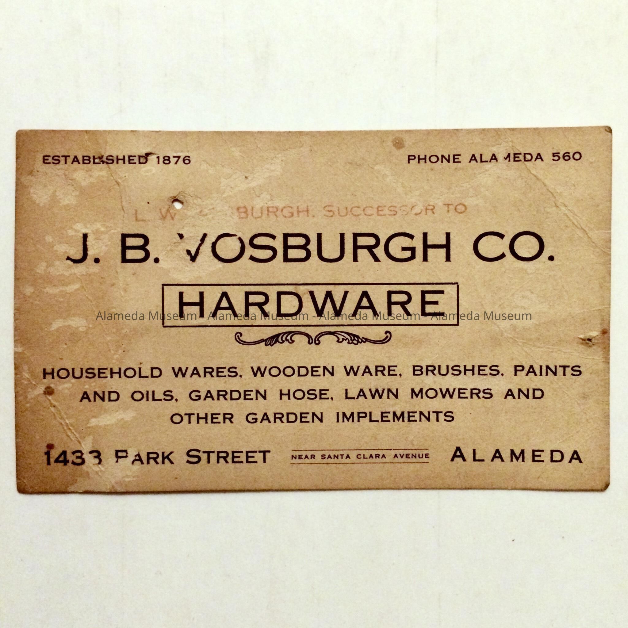 A BUSINESS CARD OF J B VOSBURGH & Co. HARDWARE, 1433 PARK STREET, ALAMEDA. REVERSE OF CARD LISTS ALAMEDA FIRE ALARM BOX(ES) LOCATIONS. THE CARD WAS FOUND AT 1530 MOZART STREET (ERECTED 1894). DONOR STILL RESIDES AT THAT ADDRESS.