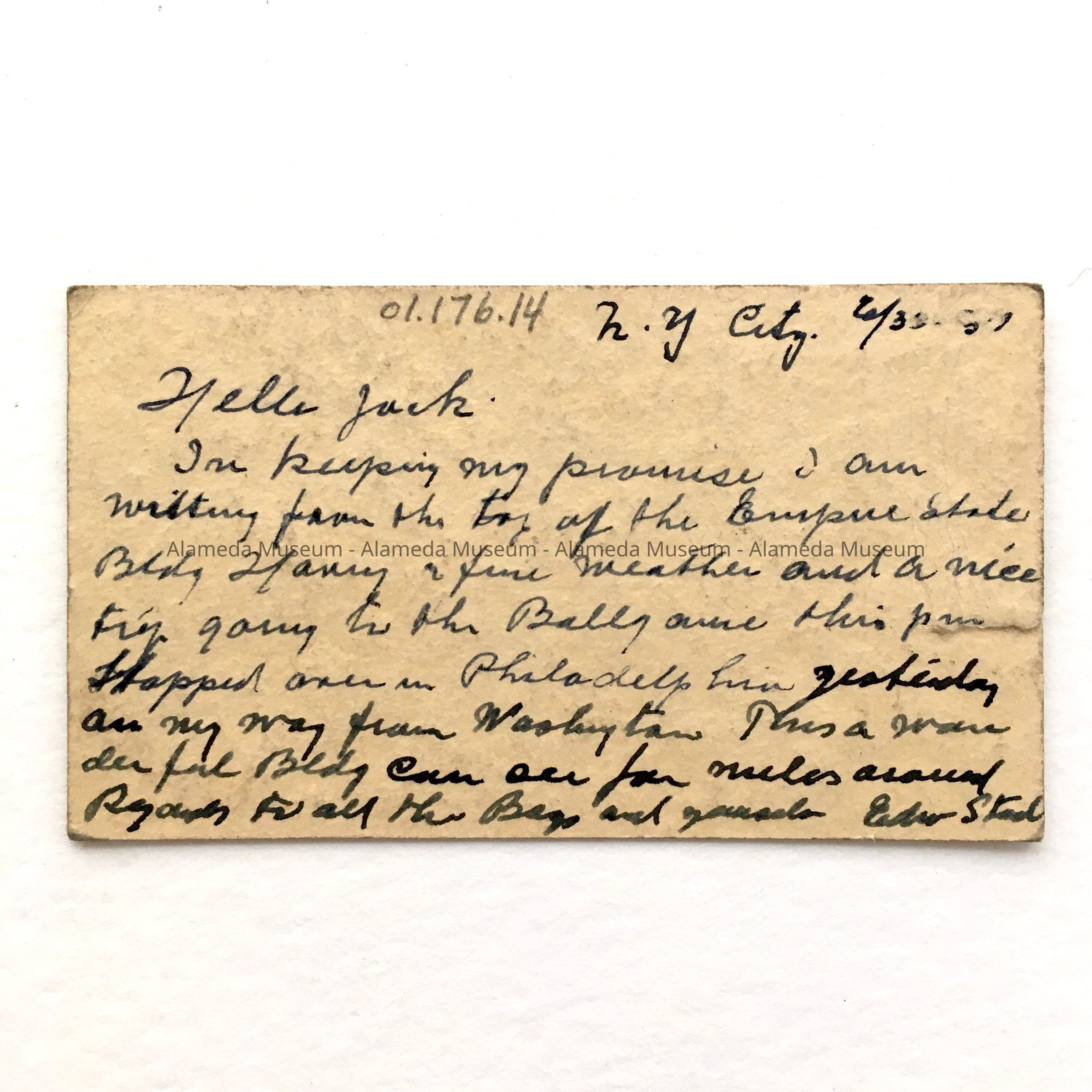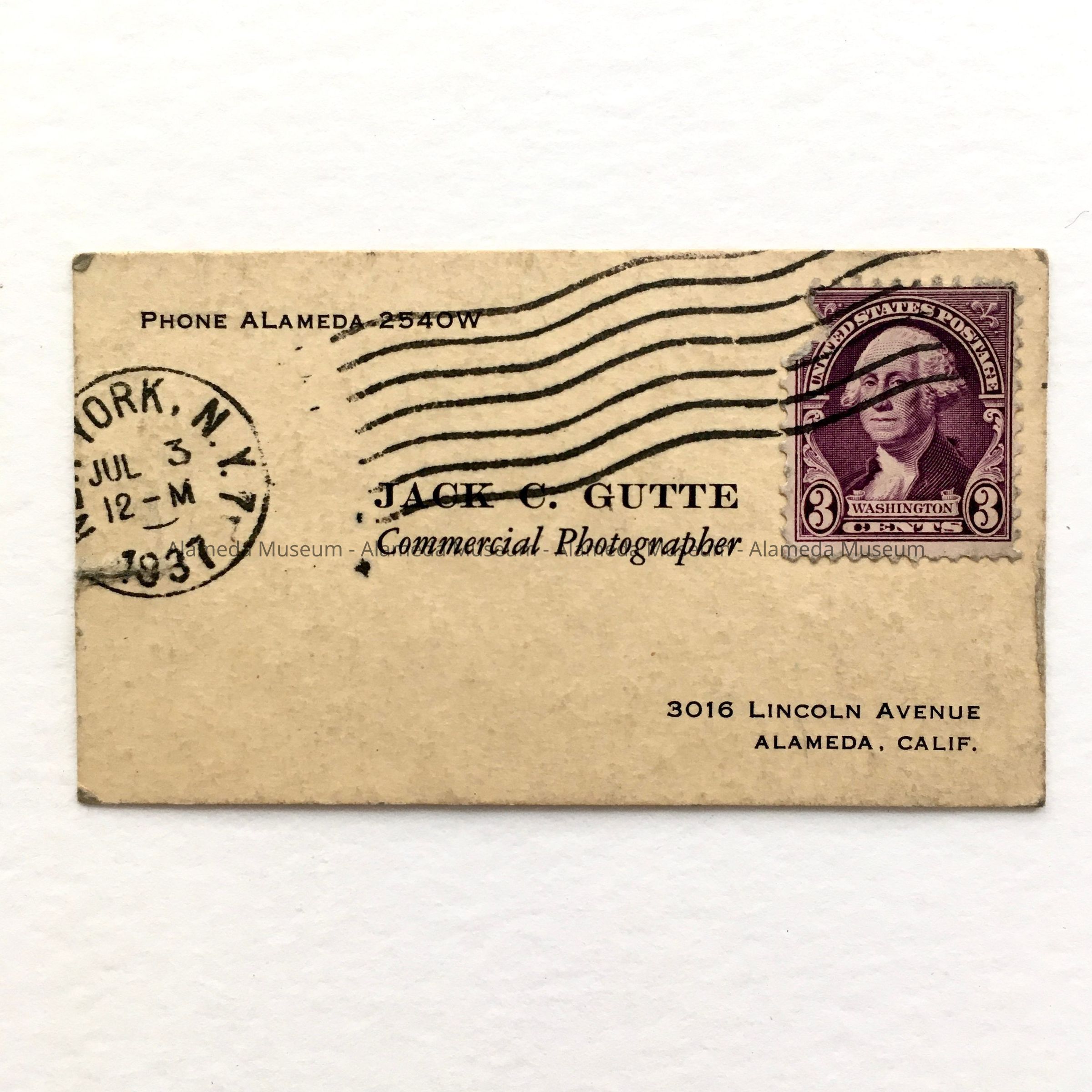 BUSINESS CARD OF JACK C GUTTE, COMMERCIAL PHOTOGRAPHER, USED BY A FRIEND AS A POSTCARD AND MAILED TO HIM AT 3016 LINCOLN AVENUE, ALAMEDA, FROM NEW YORK.