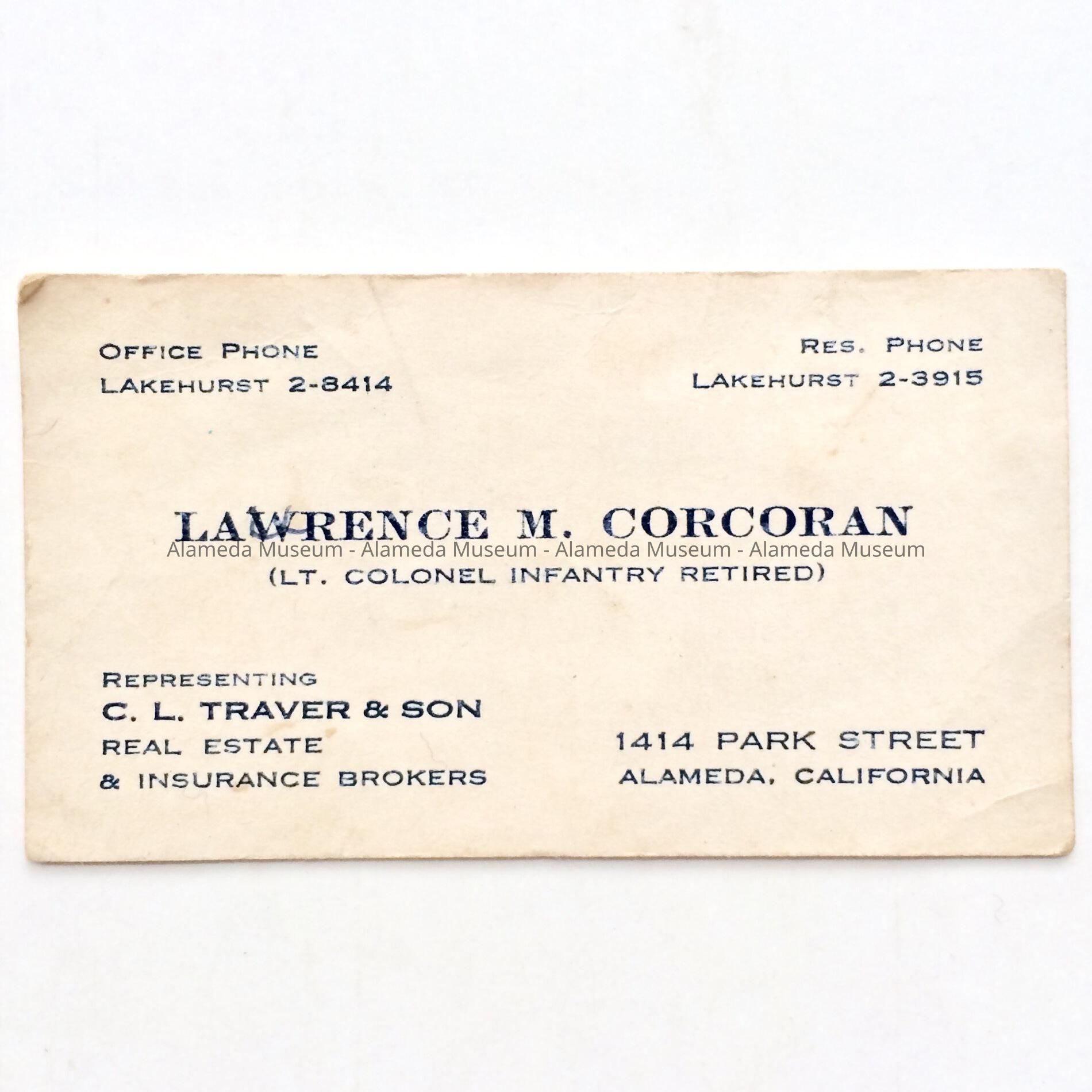 Description: Business card printed on heavy stock paper with bold printed caption of “Lawrence M. Corcoran.”