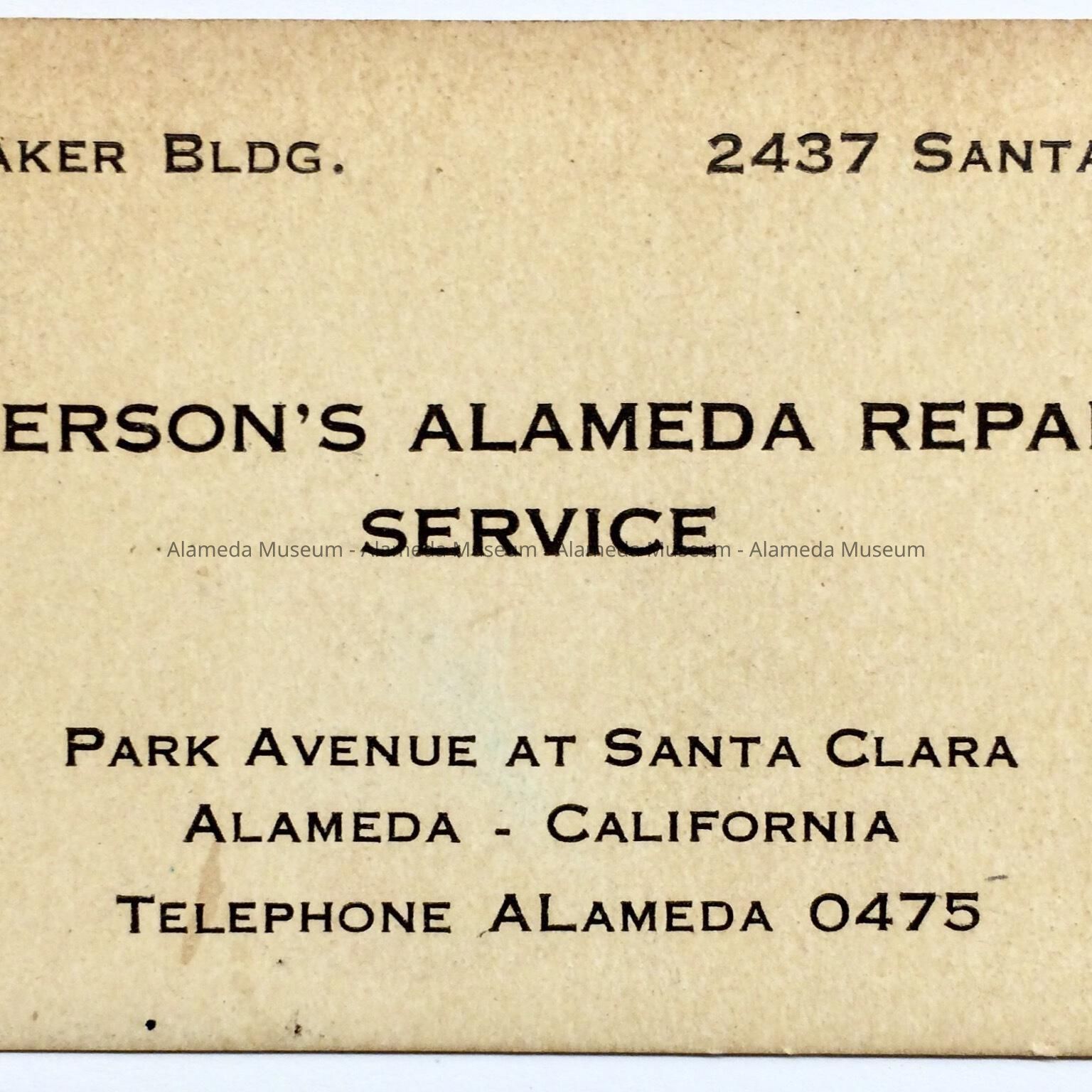 History: Business card of Pierson's Alameda Repair Service, Park Avenue and Santa Clara. Telephone: Alameda 0475.
