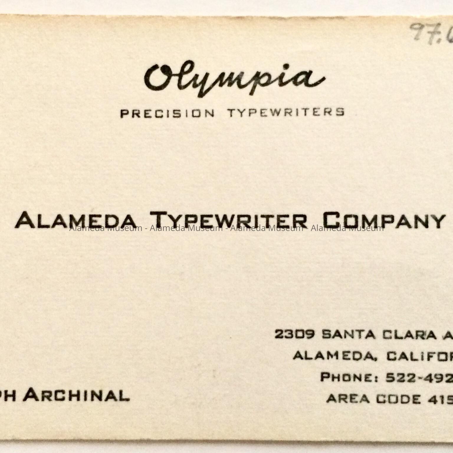 BUSINESS CARD ADVERTISING THE ALAMEDA TYPEWRITER COMPANY, (RALPH ARCHINAL, OWNER), 2309 SANTA CLARA AVENUE, ALAMEDA, CALIFORNIA. TELEPHONE: 522-4921.