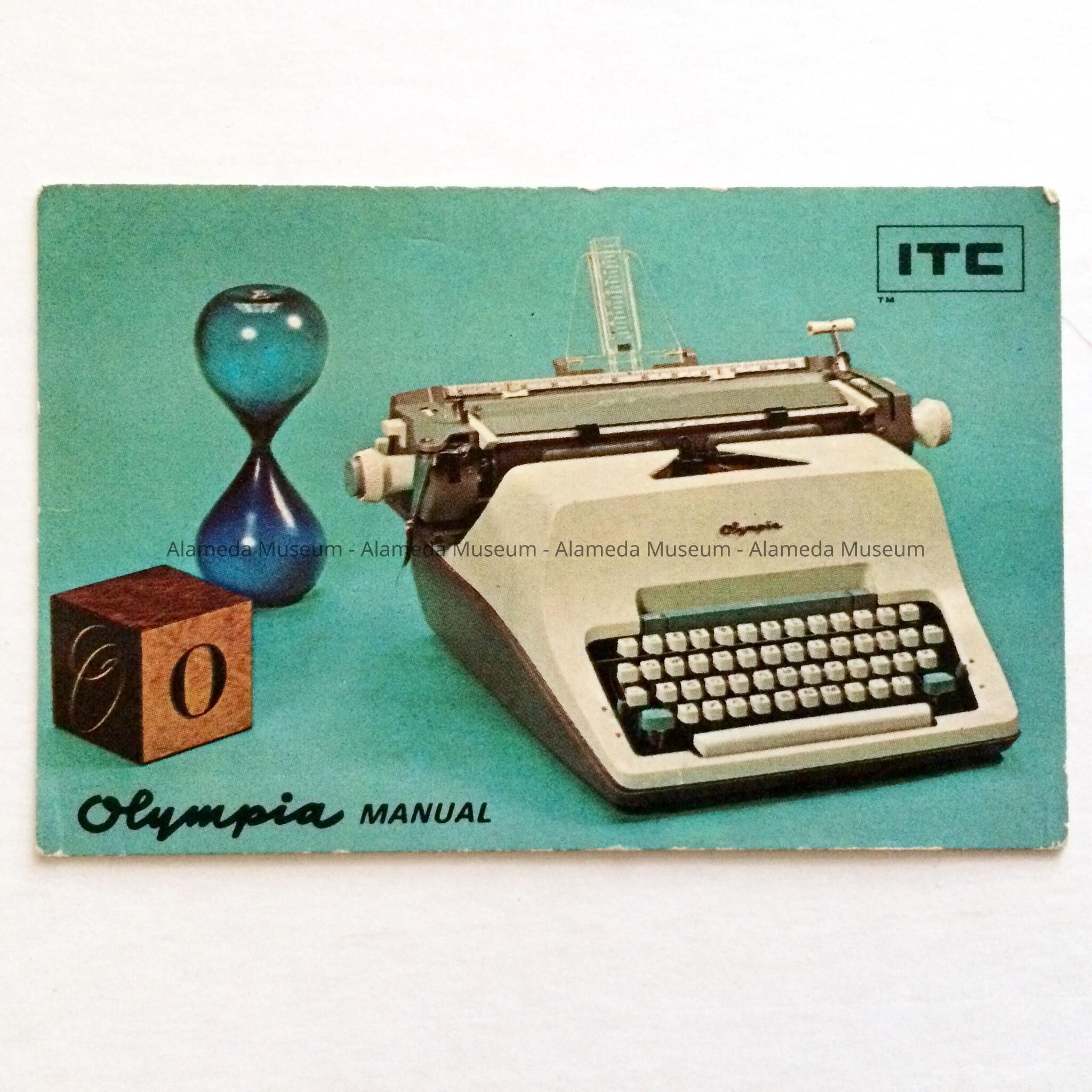 ILLUSTRATED BUSINESS CARD, ADVERTISING "OLYMPIA MANUAL TYPEWRITERS." ON THE REVERSE SIDE IS A BUSINESS MESSAGE.