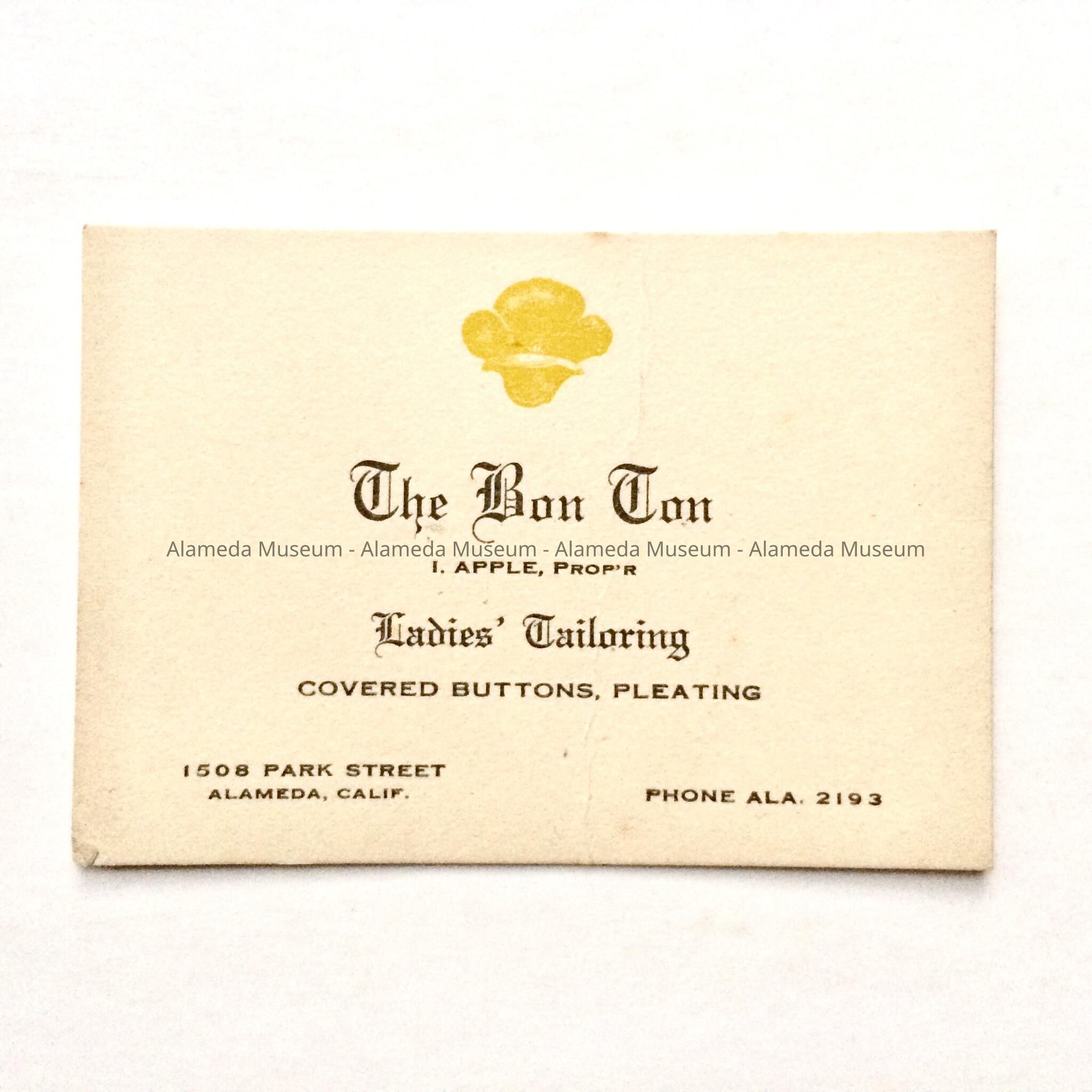 Business card of The Bon Ton, ladies tailoring at 1508 Park Street, I. Apple, Proprietor, Phone Ala-2191