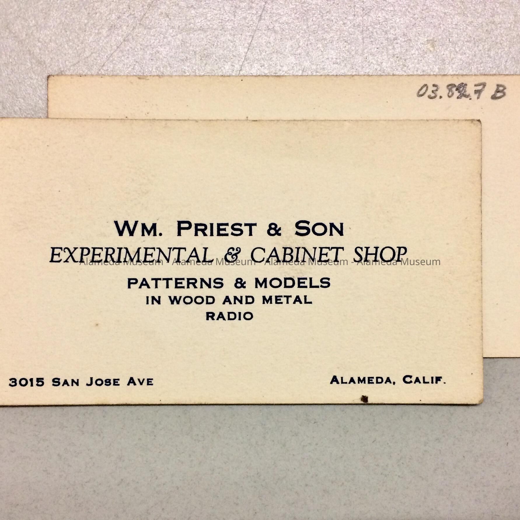 A BUSINESS CARD OF WILLIAM PRIEST AND SON, EXPERIMENTAL AND CABINET SHOP, 3015 SAN JOSE AVENUE, ALAMEDA.