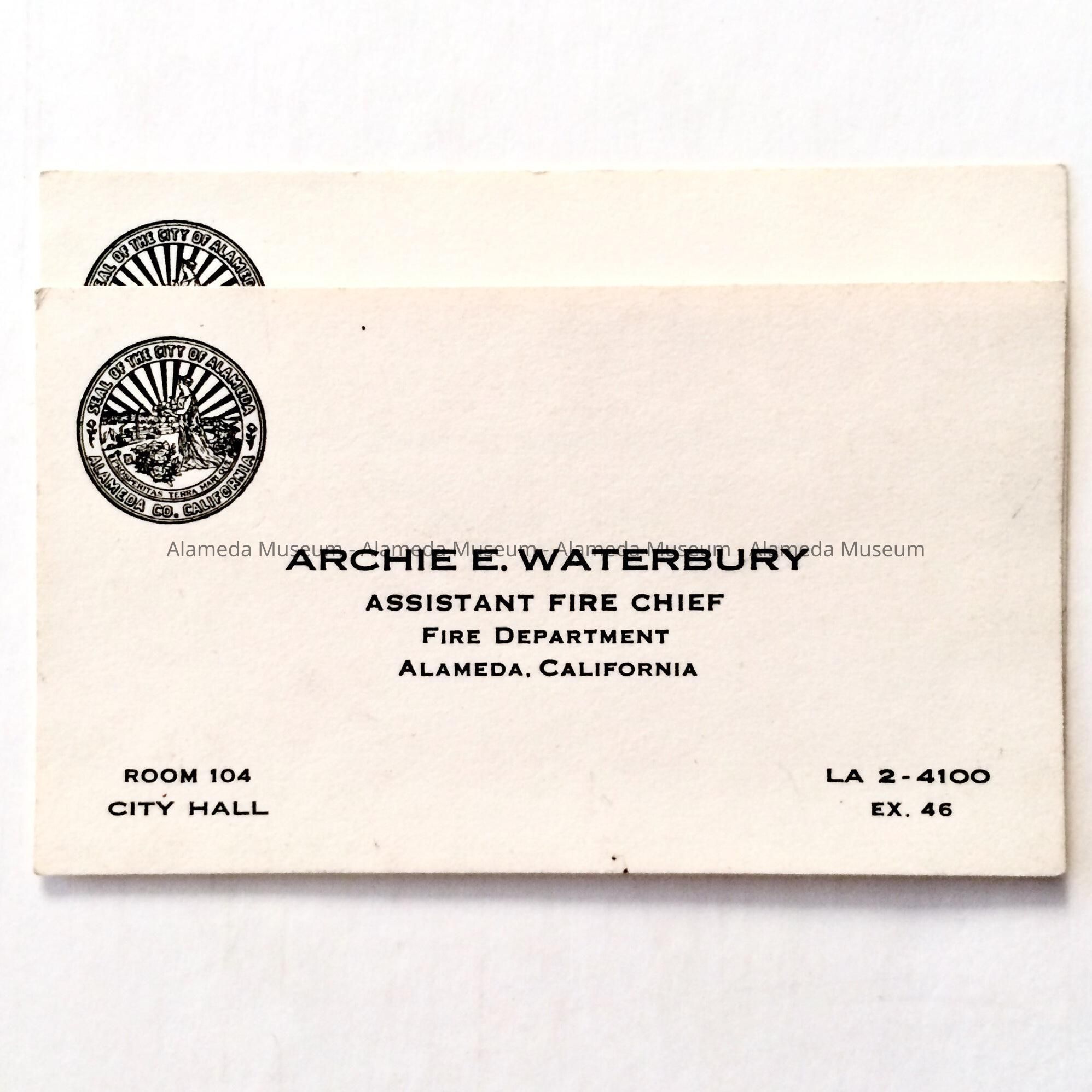 HISTORY OF OBJECTS: BUSINESS CARDS OF THE LATE ARCHIE E. WATERBURY, ASSISTANT FIRE CHIEF, CITY OF ALAMEDA. ARCHIE WAS BORN IN ALAMEDA IN 1915 AND PASSED AWAY IN 2007.