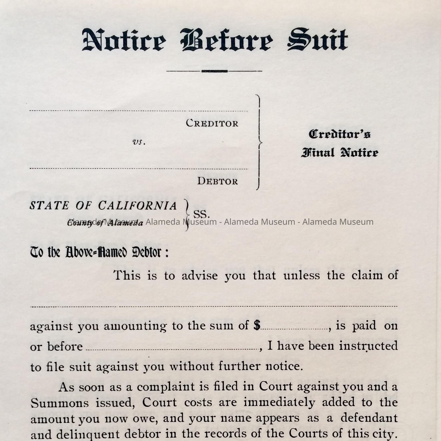 Description: Printed form with heading in bold type "Notice Before Suit."