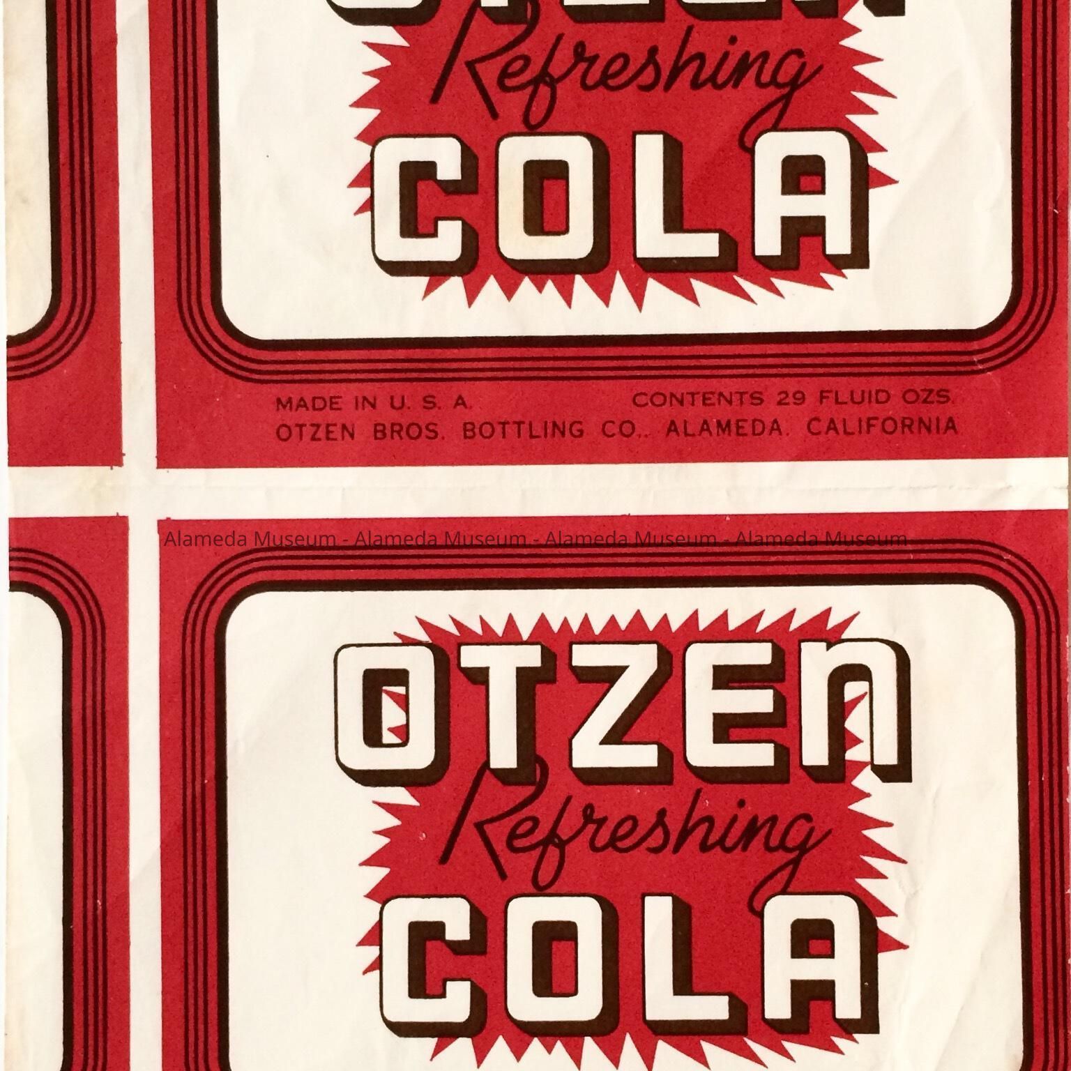 History of Object: Printed paper bottle label for Otzen Cola, Otzen Brothers Bottling Co., Alameda, CA. Circa 1930's.