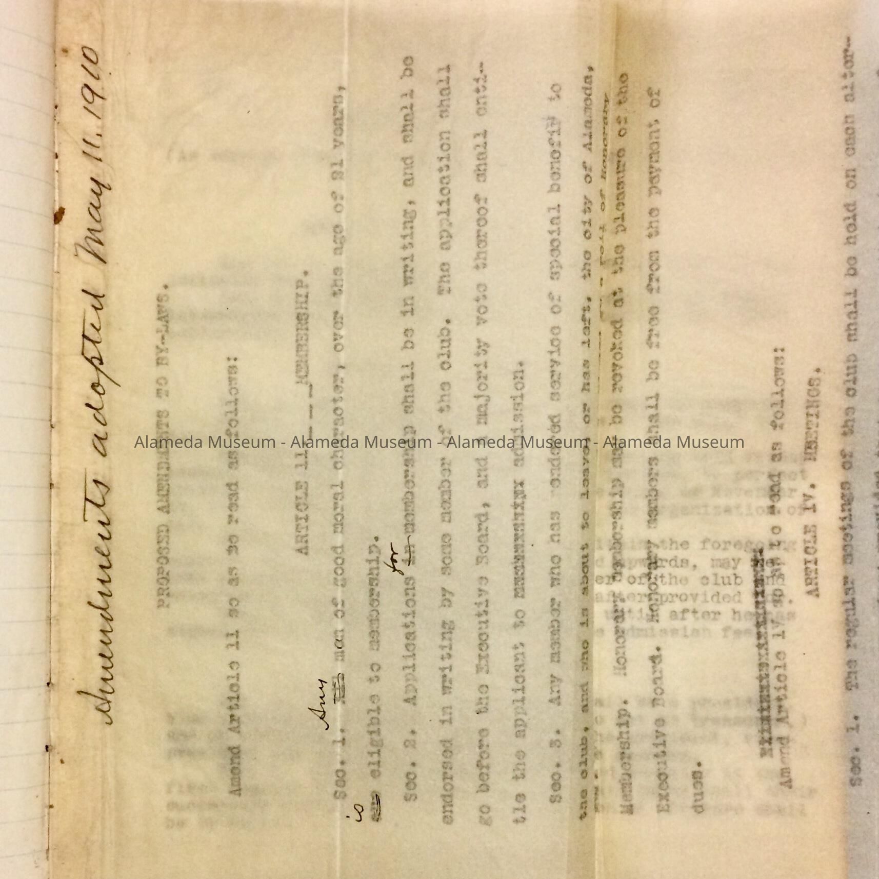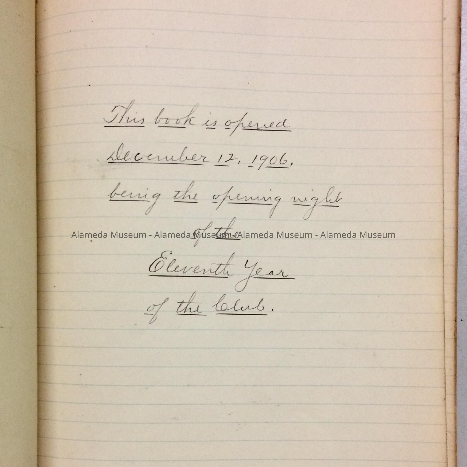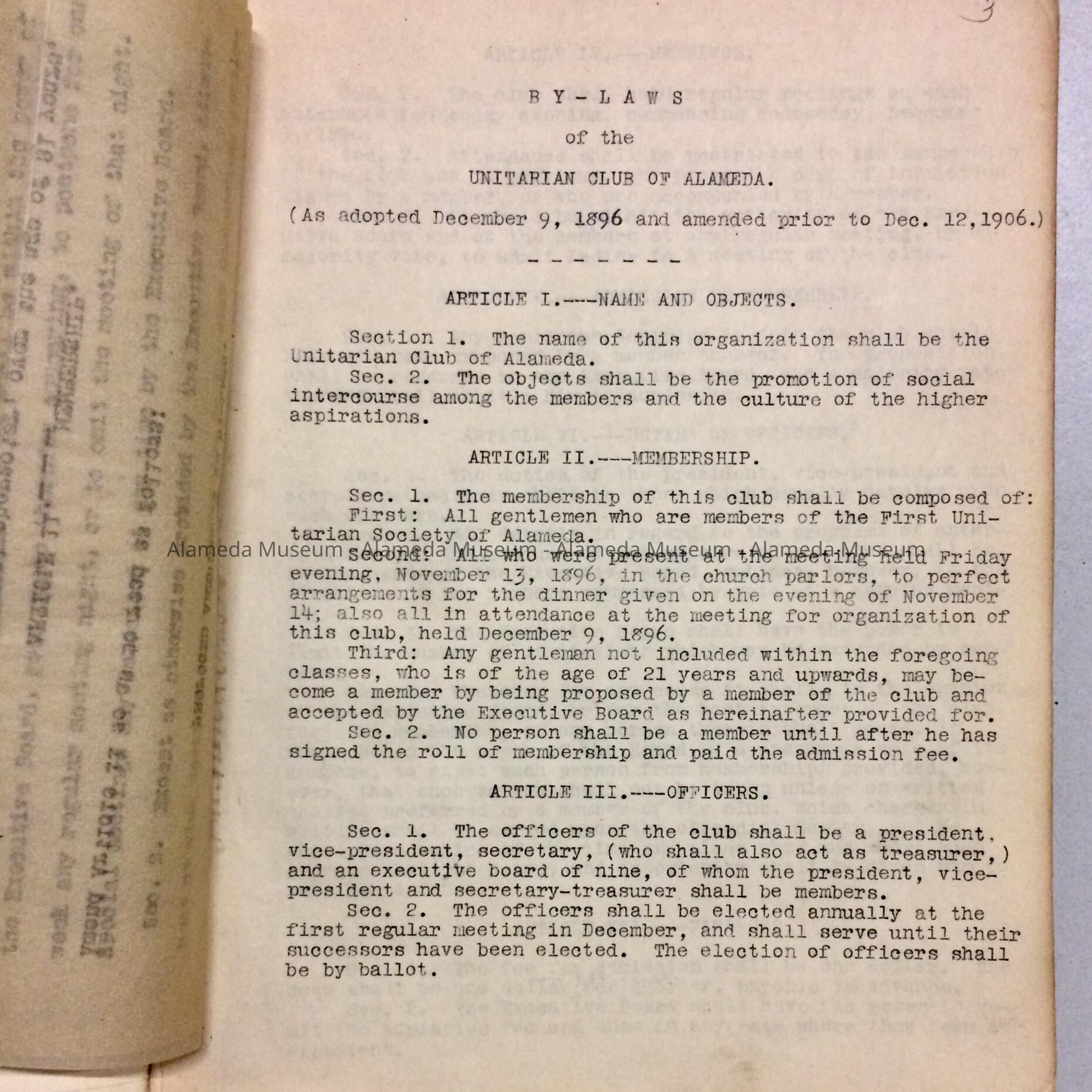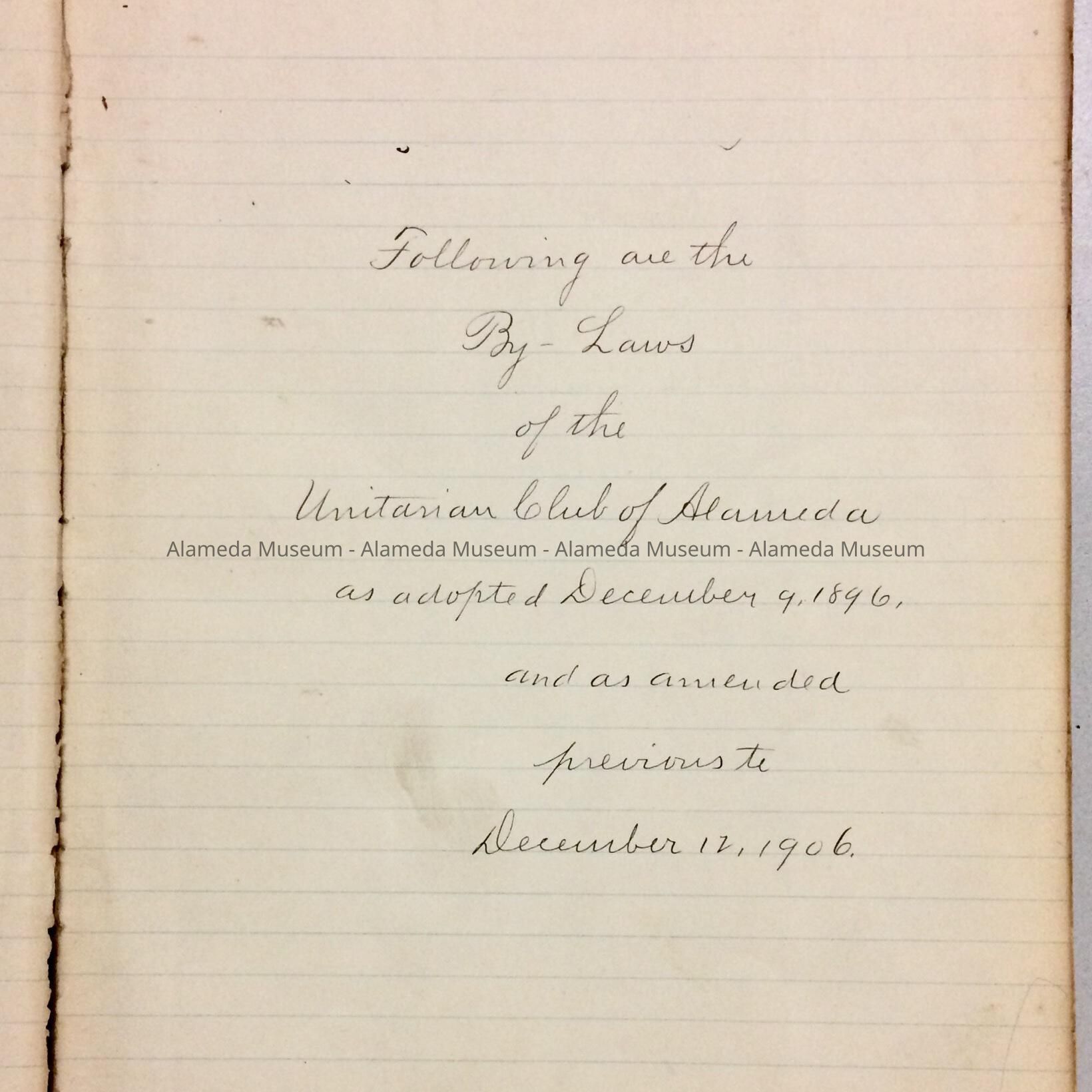 BY-LAWS AND MEMBERSHIP ROLL OF THE UNITARIAN CLUB, ORGANIZED IN ALAMEDA ON DECEMBER 9, 1896. THE BOOK ALSO INCLUDES SIGNATURES OF ROLL MEMBERSHIP AND THEIR ADDRESSES. BY-LAWS WERE GIVEN TO THE ALAMEDA HISTORICAL SOCIETY PRIOR TO 1971, NUMBERED "174-X," AND HERETOFORE NOT OFFICIALLY CATALOGED.