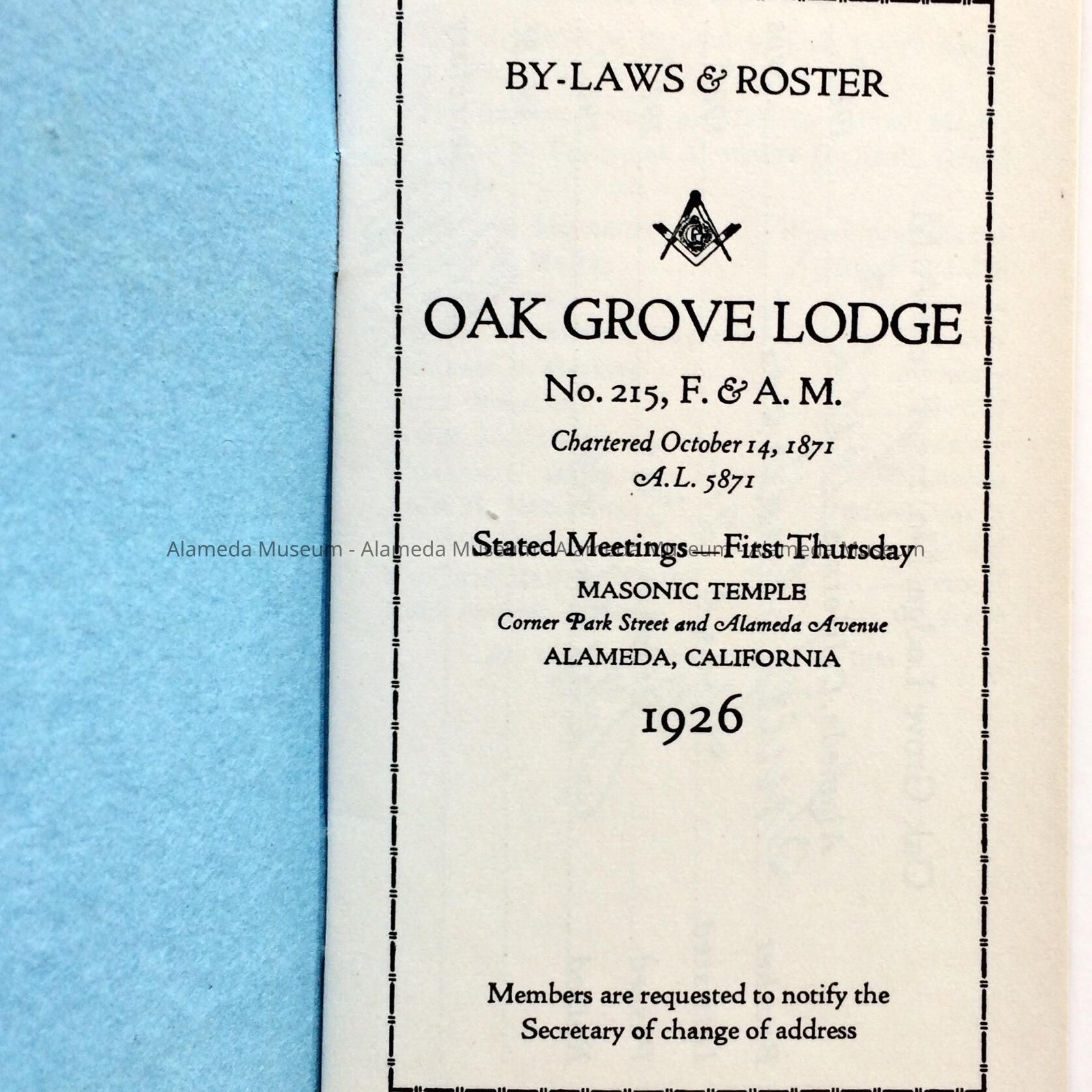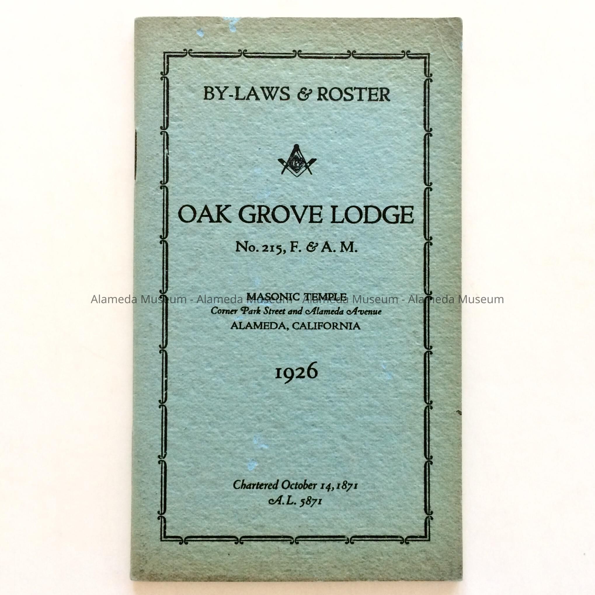 A BOOKLET OF BY-LAWS AND MEMBERSHIP ROSTER OF THE OAK GROVE LODGE NO. 215 OF THE MASONS, DATED 1926. ADDRESS WAS LISTED AS "CORNER, PARK STREET AND ALAMEDA AVENUE," ORIGINAL LOCATION OF THE MASONS. MEMBERSHIP INCLUDED A LIST OF NAMES AND ADDRESSES OF MEMBERS.