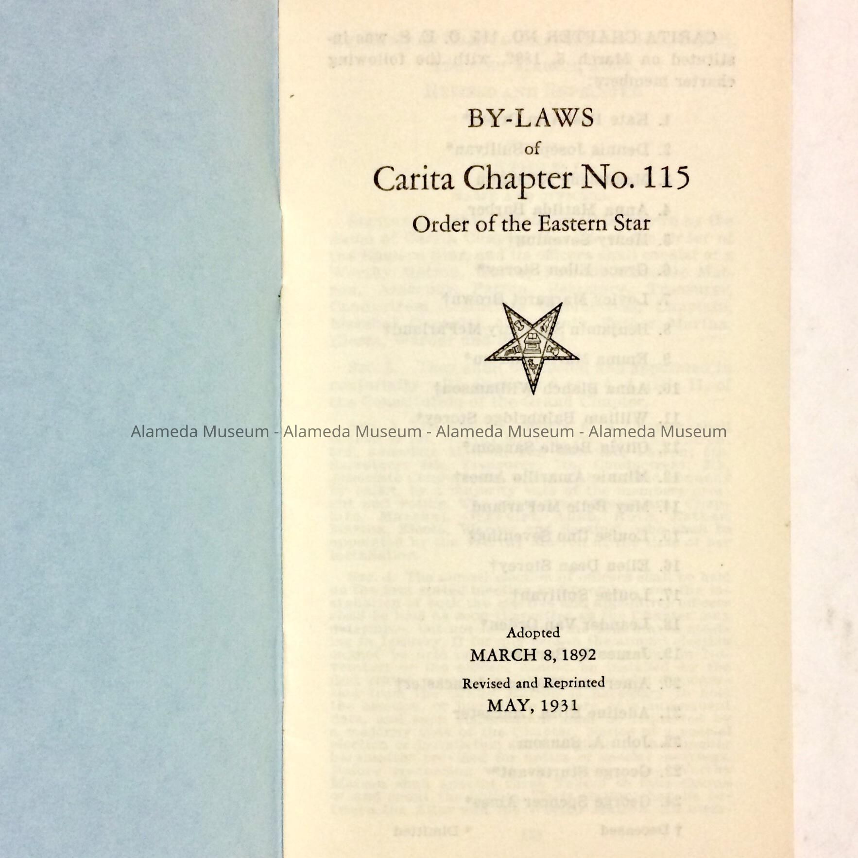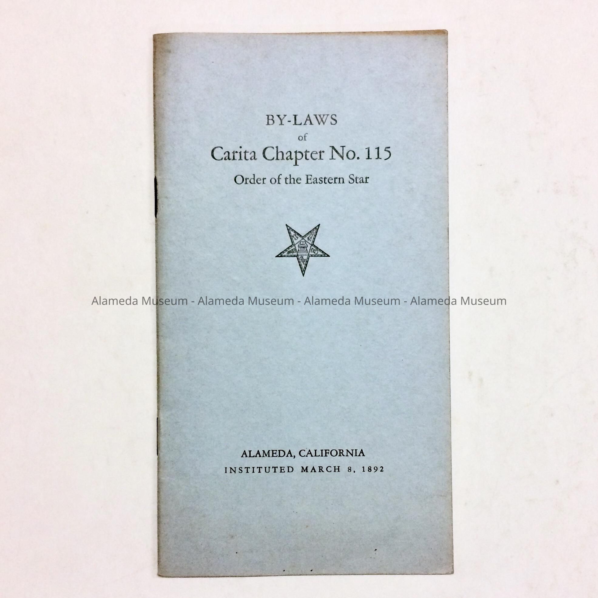 HISTORY OF OBJECT: A BOOKLET CONTAINING BY-LAWS OF THE CARITA CHAPTER, ORDER OF THE EASTERN STAR, ALAMEDA DATED MAY 1931.