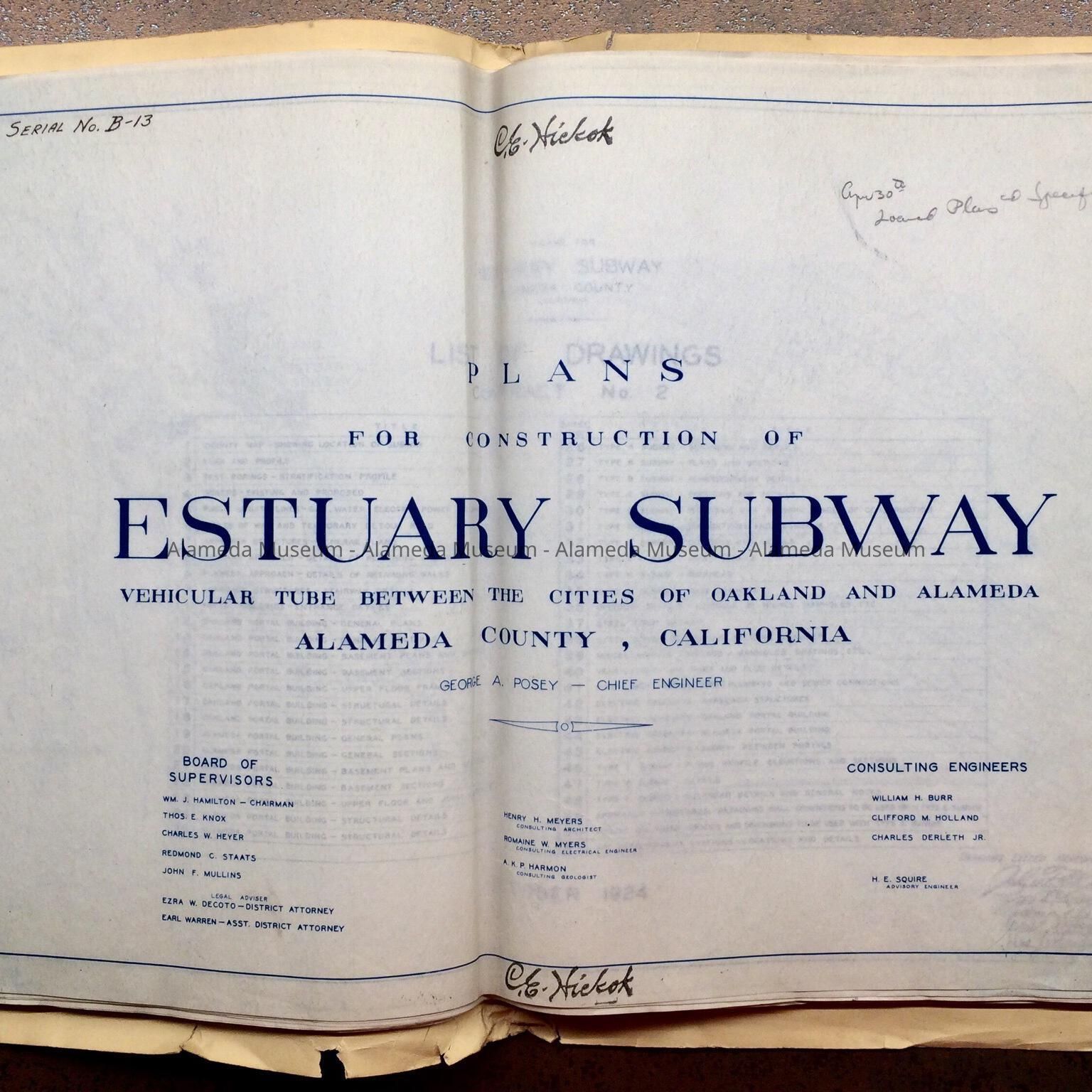 Description: Blueprints, secured to a backing of card stock with brass brads, folded over the front. Blueprints are titled ‘Plans for construction of Estuary Subway vehicular tube between the cities of Oakland and Alameda. George A. Posey - Chief Engineer. Lists Henry H. Meyers, Consulting Architect.