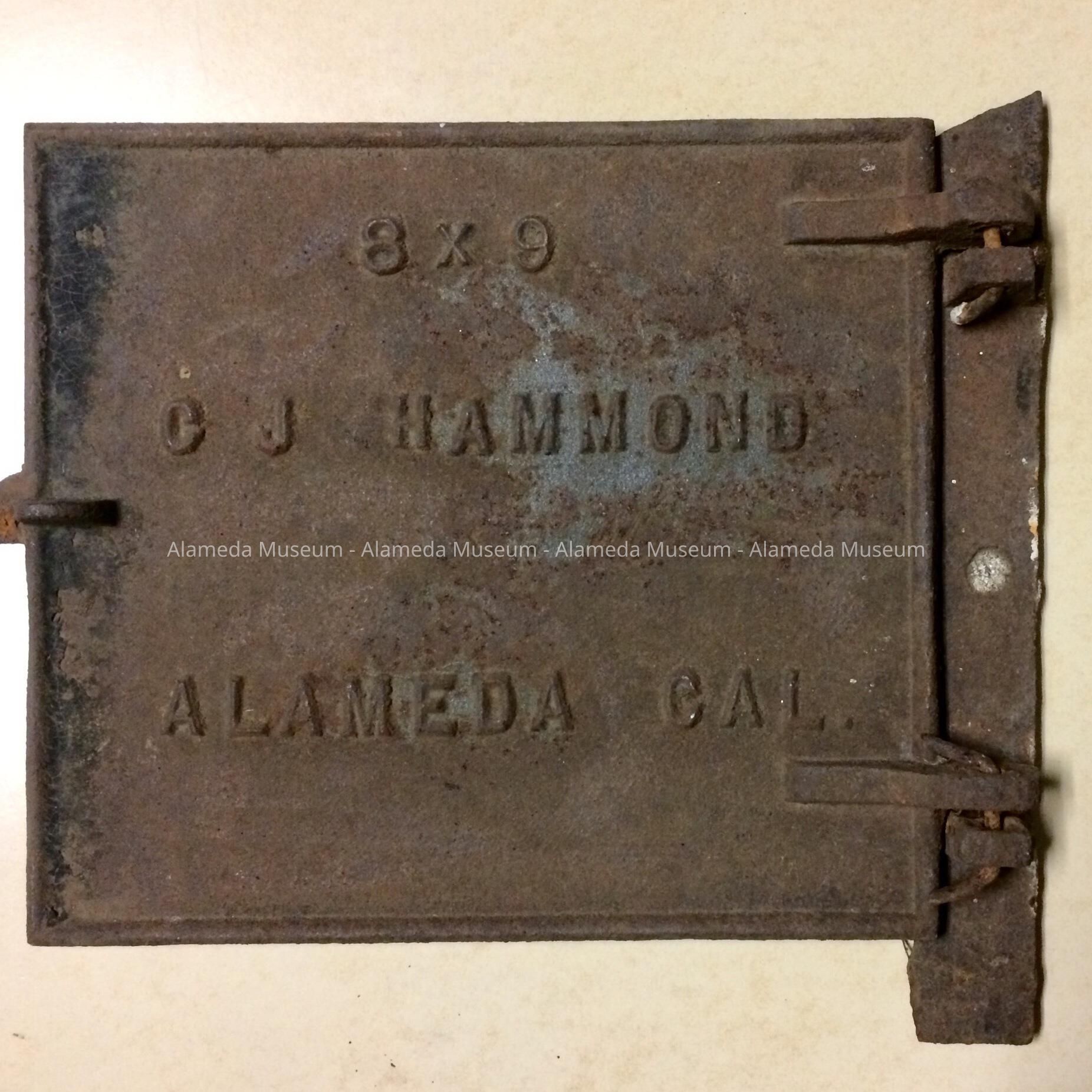 Description: A cast iron door with attached hinge and grip opener, with raised lettering reading: "8 x 9 in. C. J. Hammond Alameda Cal."