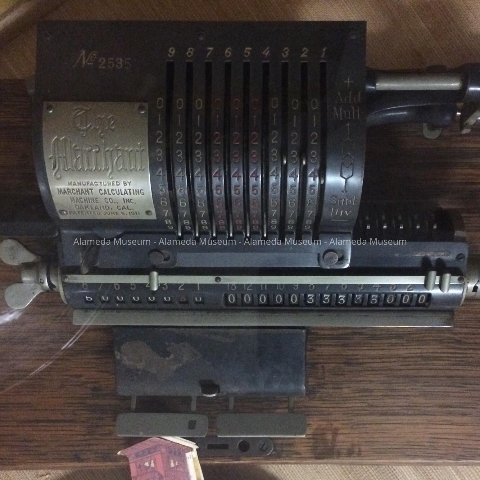 Description: This calculating machine is #2535, manufactured by Marchant Calculating Machine Company, Inc. Oakland, California. Patented June 6, 1911. Black iron... all fittings are nickel plated. It rests on an oak base sixteen inches by ten inches.