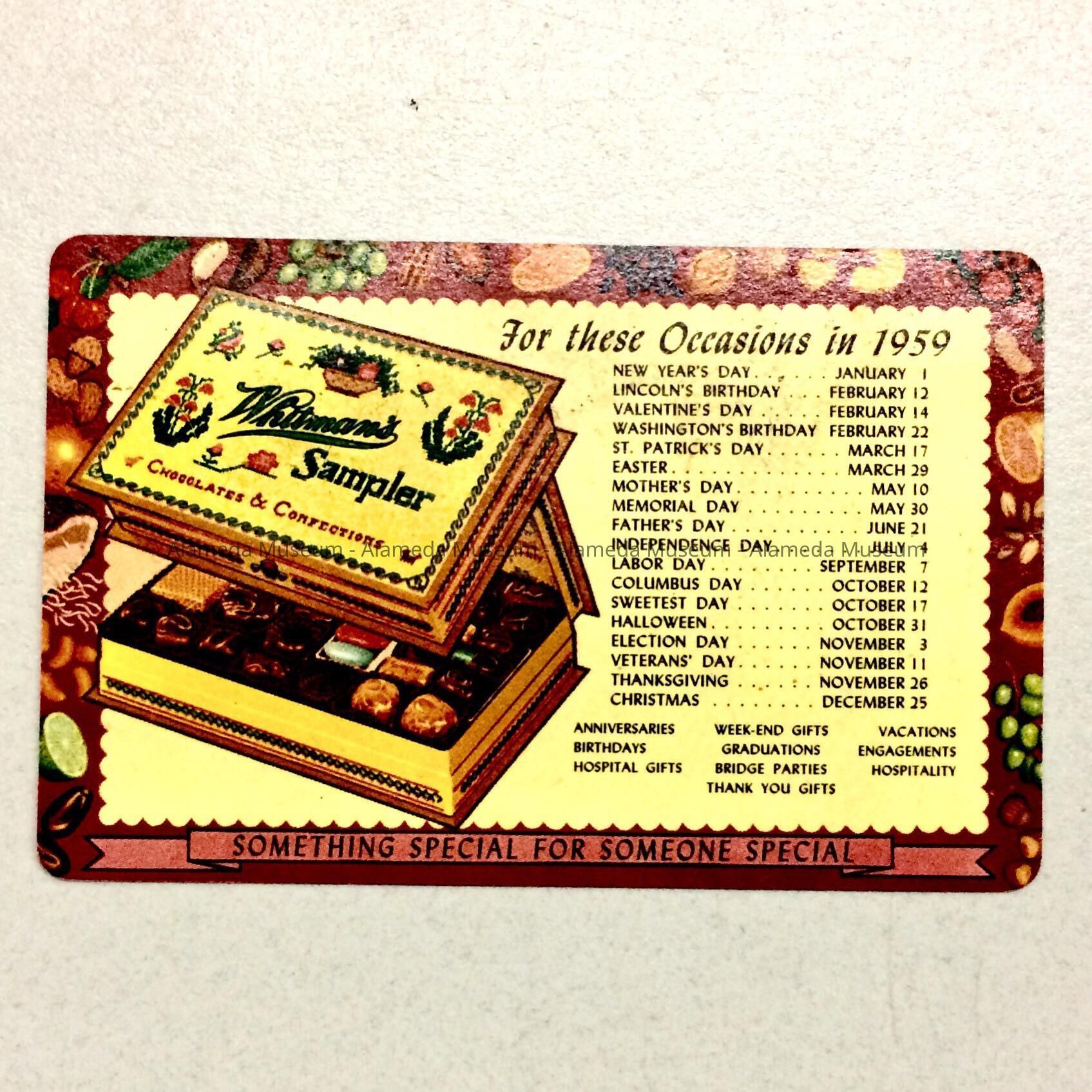 History of Object: A calendar advertising Whitman's Sampler Chocolates issued by the Alameda Drug Co., 1501 Park Street.