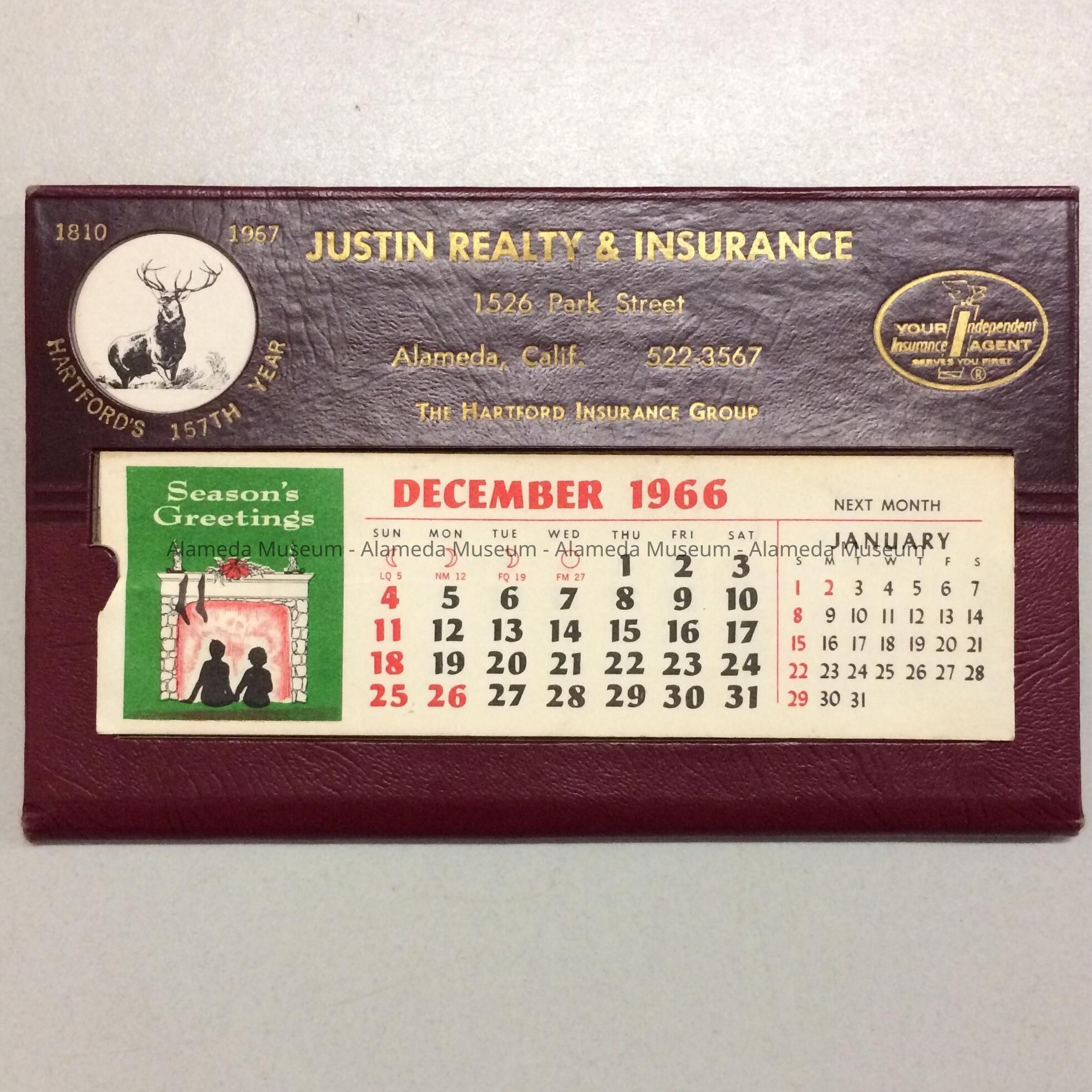 HISTORY OF OBJECT: A PREMIUM CALENDAR AND TELEPHONE INDEX ISSUED BY JUSTIN REALTY AND INSURANCE, 1526 PARK STREET, ALAMEDA.
