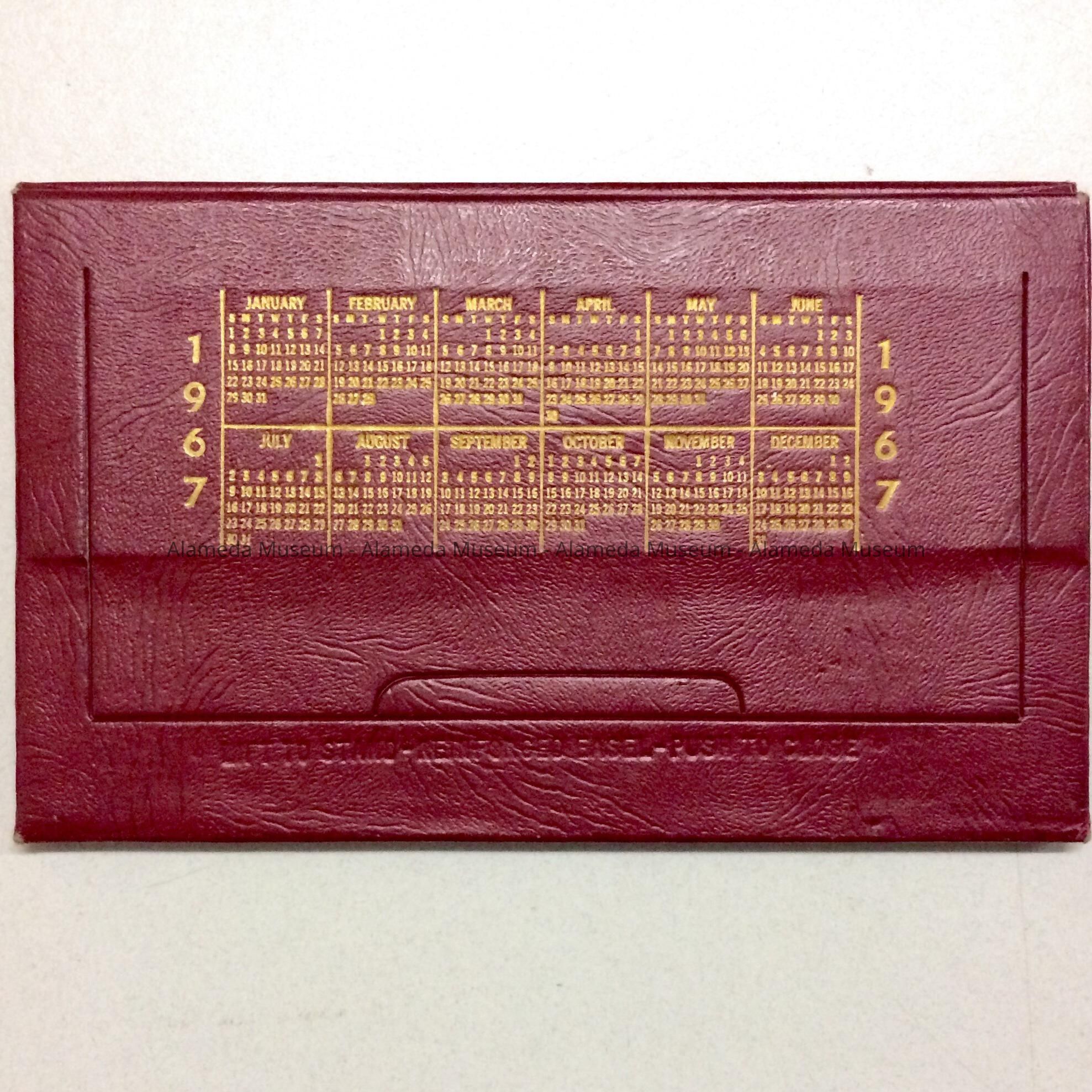 DESCRIPTION: A DESK CALENDAR IN A THICK CARDBOARD COVER WHICH SERVES AS A STAND. THE CALENDAR HAS REMOVABLE PAGES. COVER IS A WINE COLOR WITH GOLD-COLORED CAPTION.