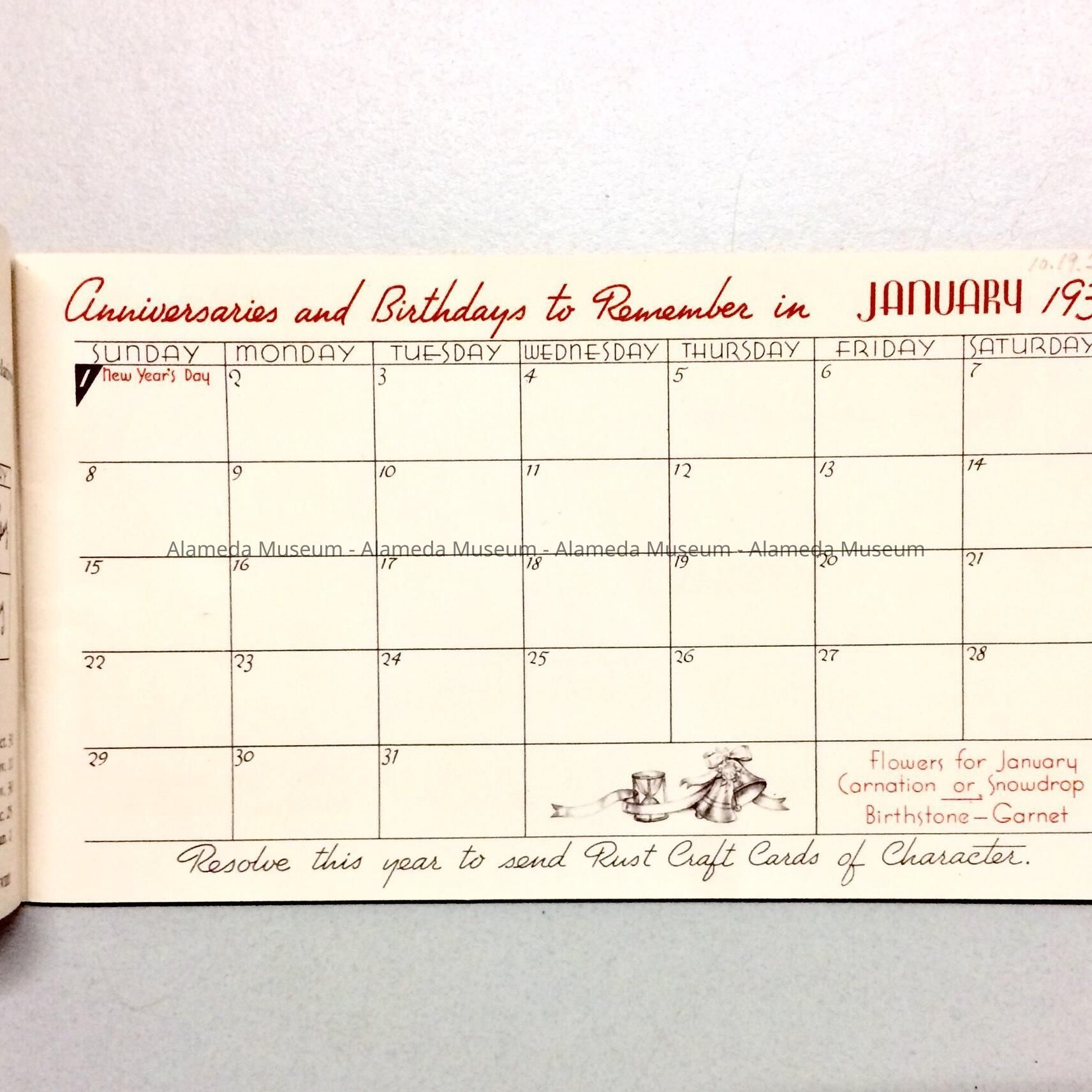 History of Object: A 1939 calendar booklet by Gadsden Stationers of 1435 Park Street.