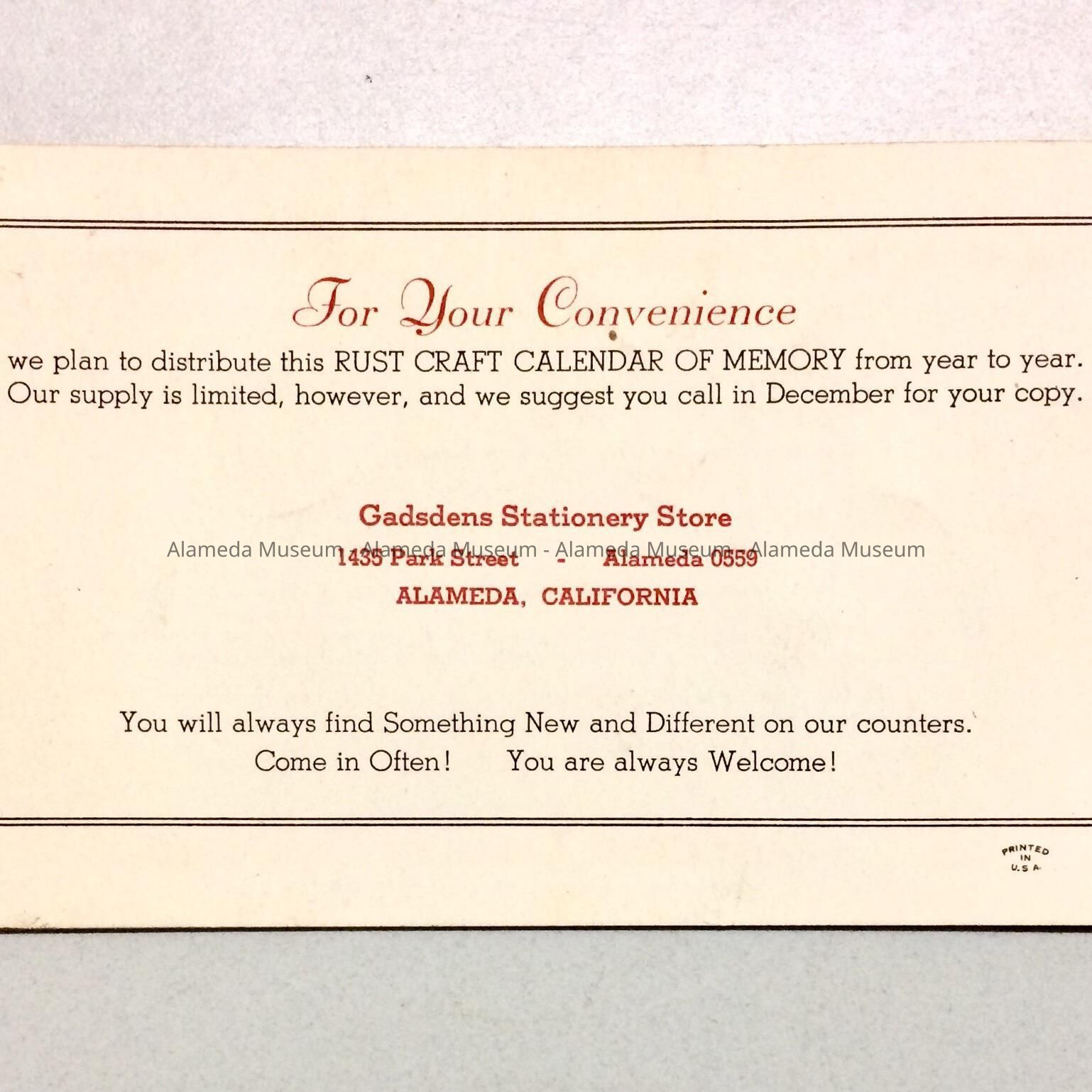 Calendar booklet by Gadsden Stationers, of 1435 Park Street, 1939Entry/Object ID