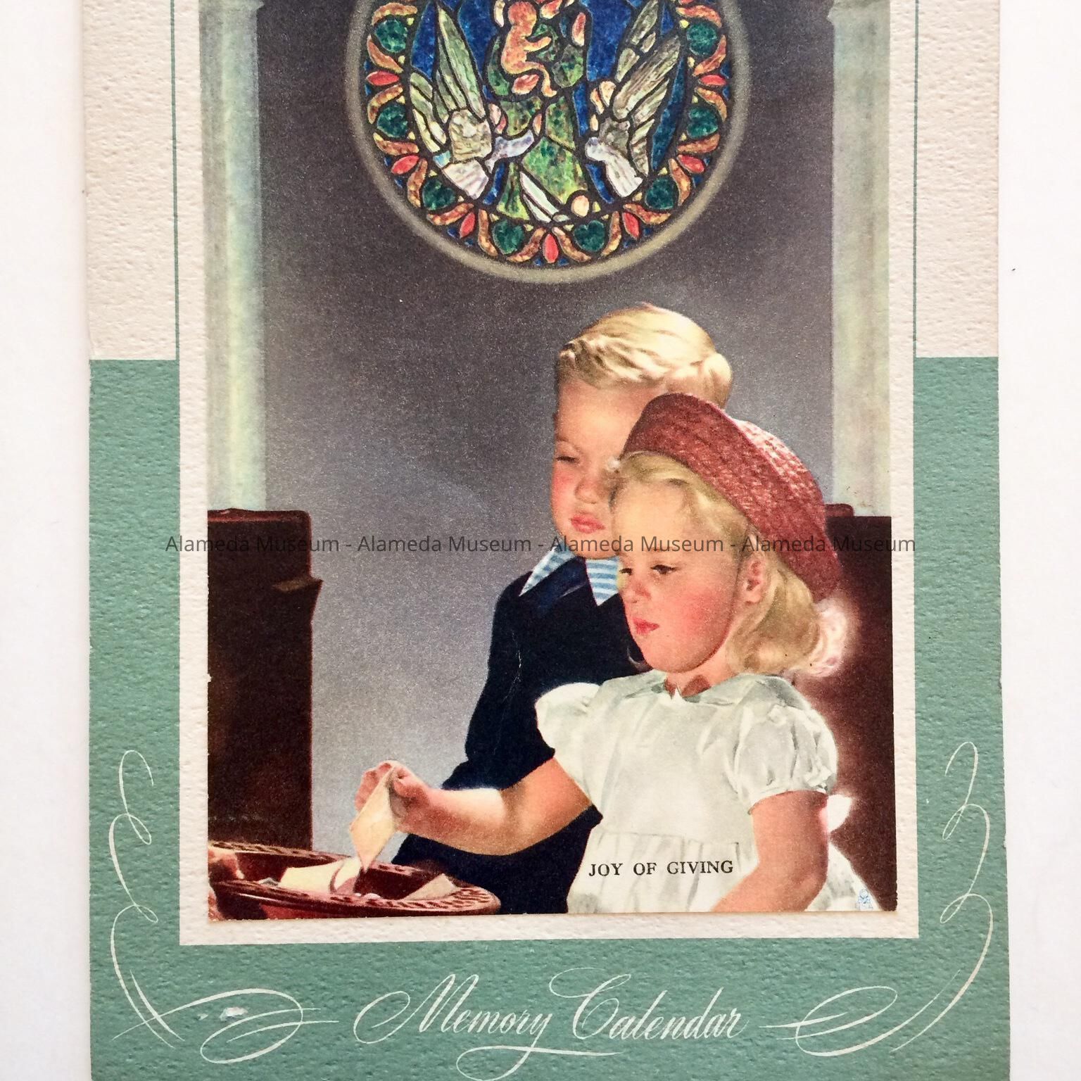 Description: A booklet-style calendar with an illustrated cover, the design featuring two children in a church setting.