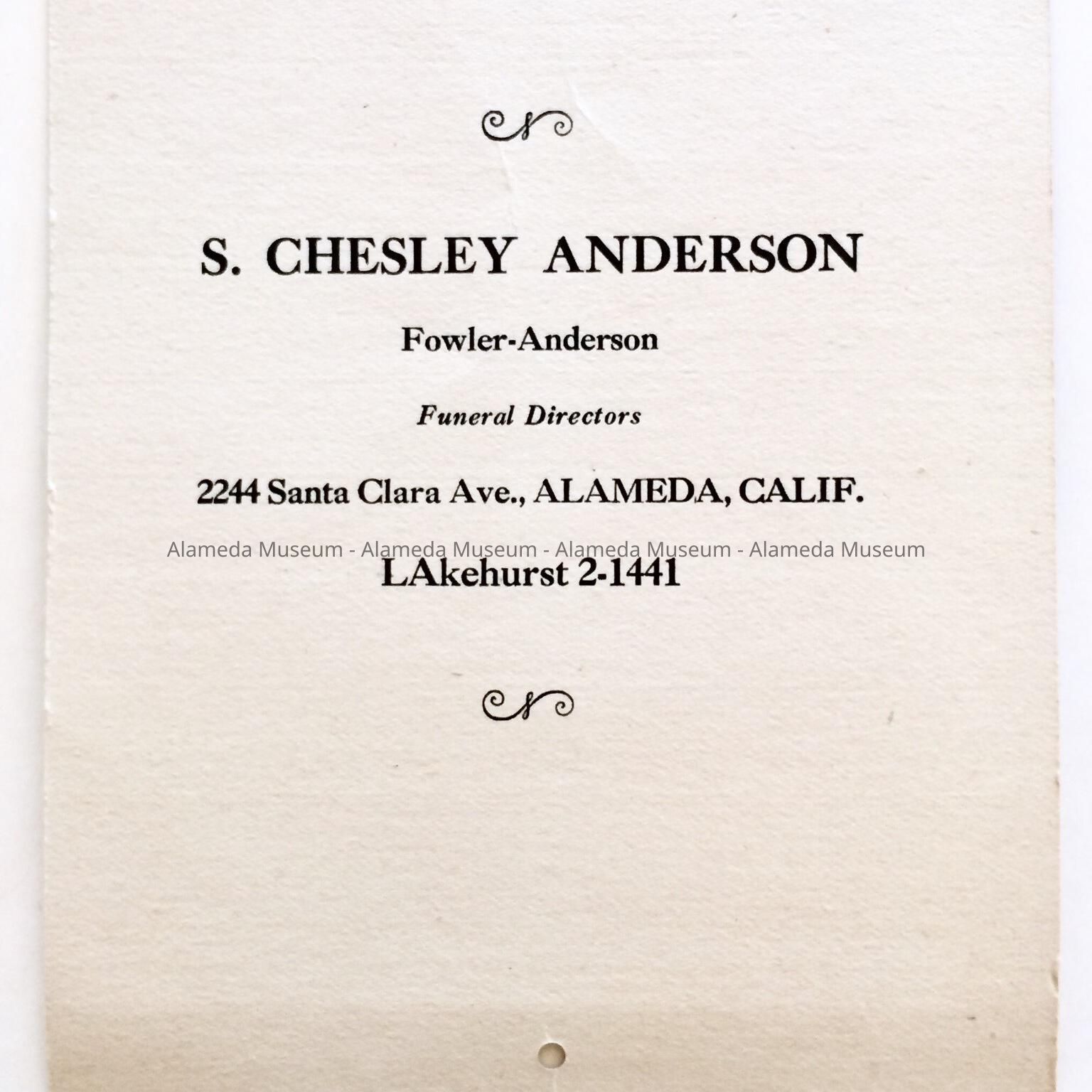 History of Object: A calendar with a memo pad issued by S. Chesley Anderson of Fowler-Anderson Funeral Directors, 2244 Santa Clara Ave., Alameda.