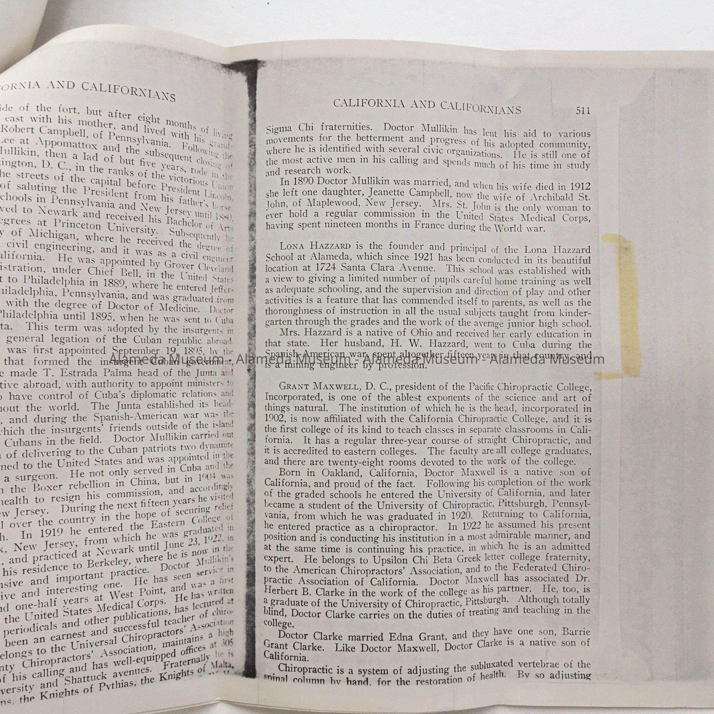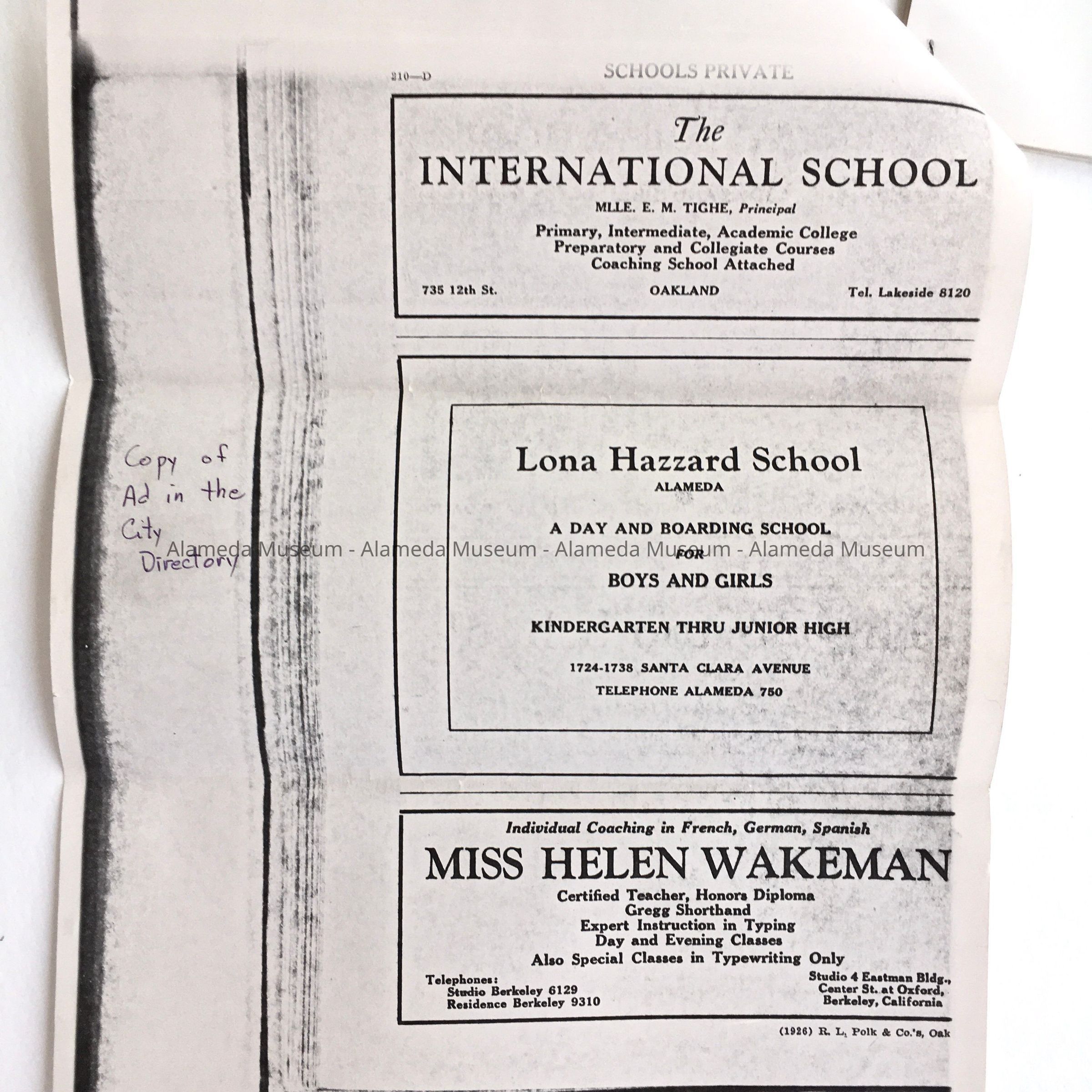 History: Brief history of the Lona Hazzard Private School that was located at 1724 Santa Clara Avenue which appeared in a book entitled, “California and Californians”, edited by Rockwell D. Hunt and printed in the late-1920s. The Hazzard School, a day and boarding school for boys and girls, kindergarten through junior high, was located for several years in the present Girls' Club building at 1724 Santa Clara Avenue.