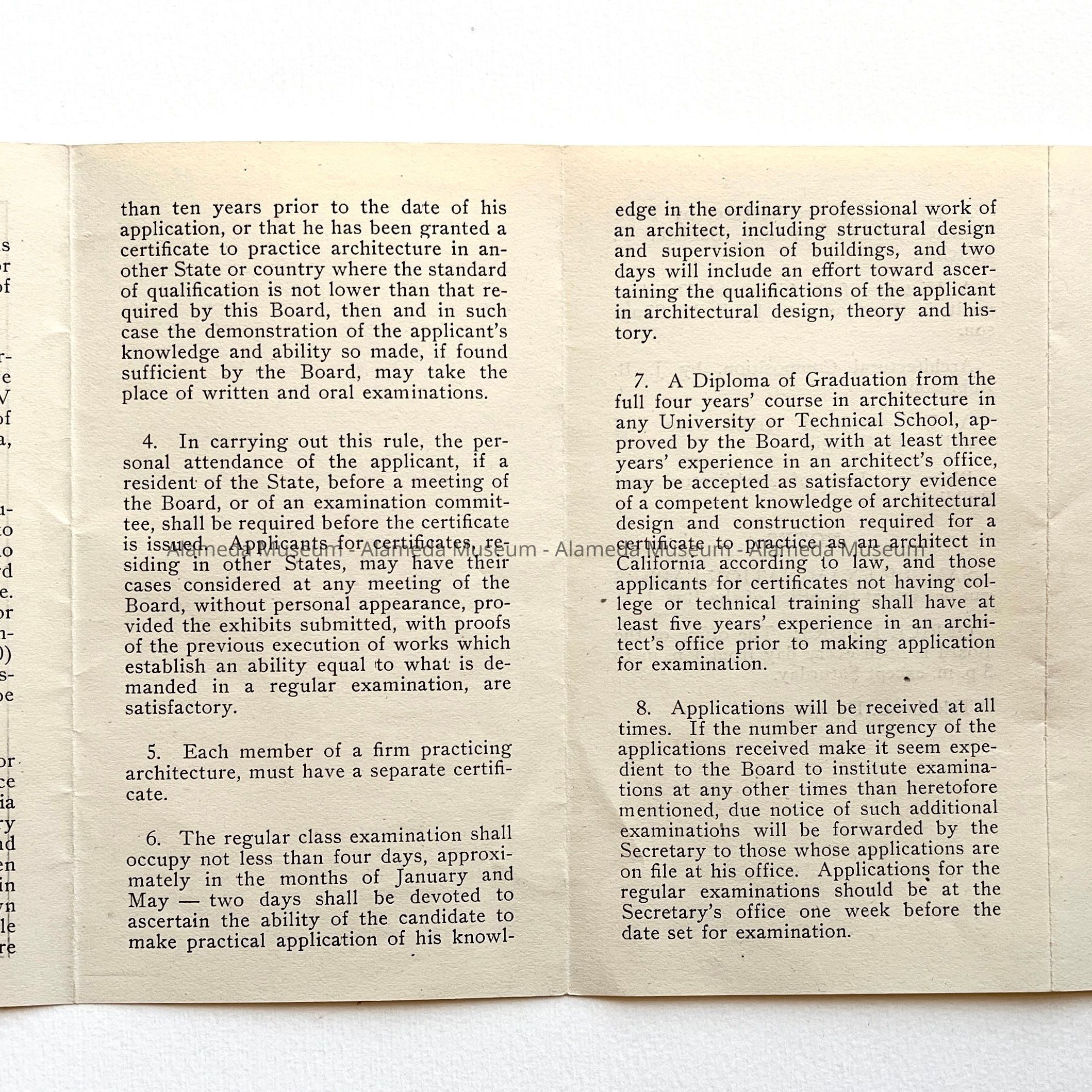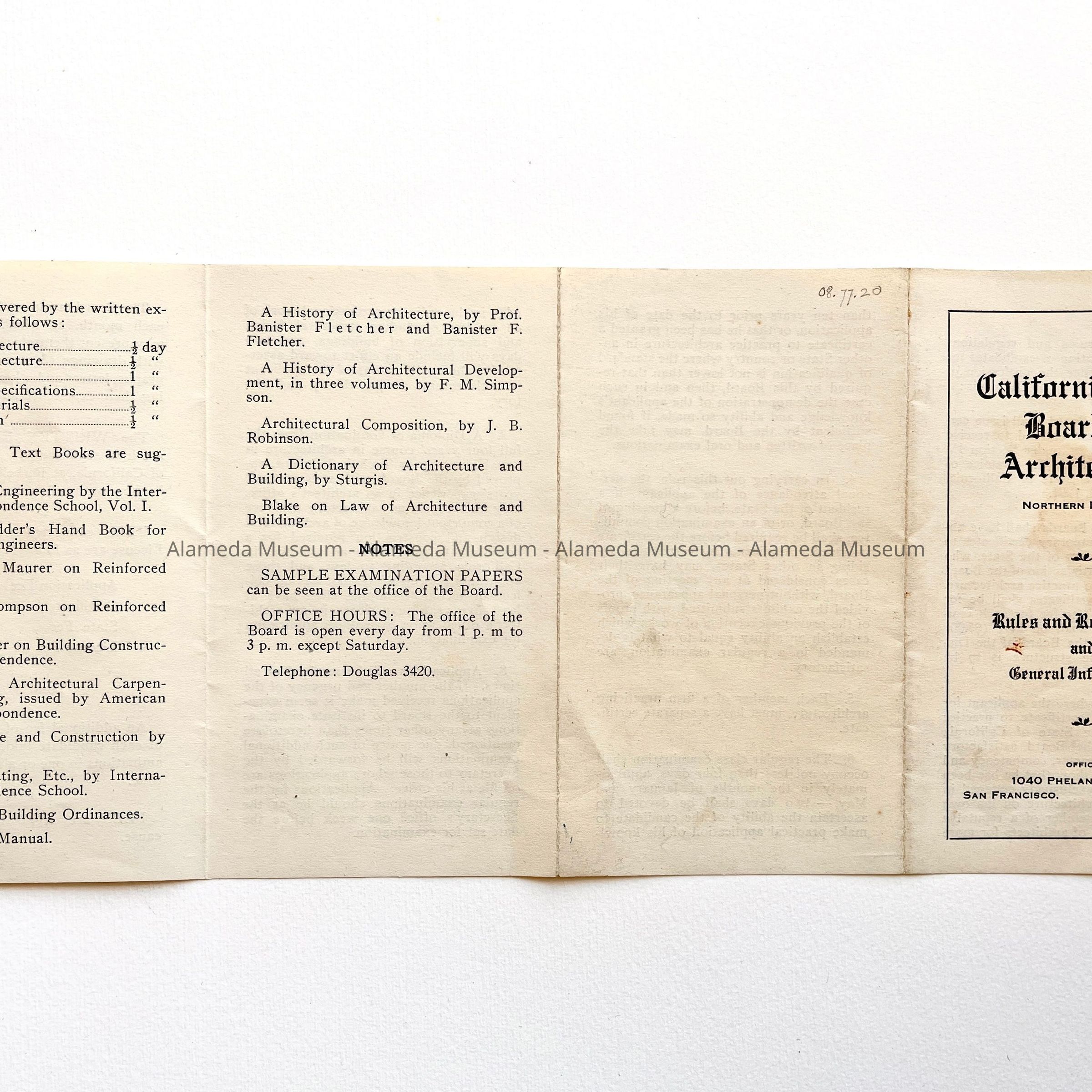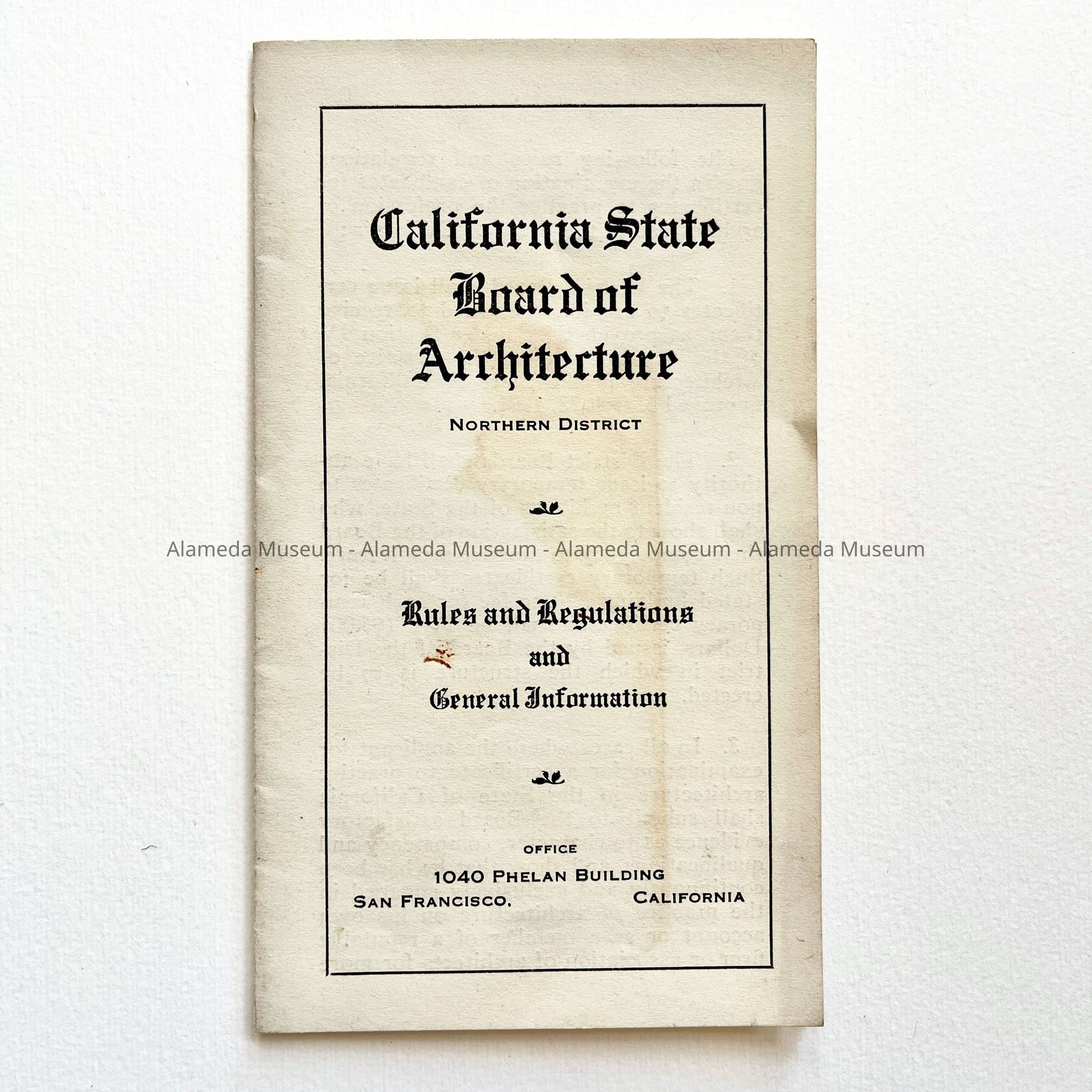 Description: a flyer, printed both sides, folded twice, so front page states in gothic letters: California State Board of Architecture’; in normal type: ‘Northern District’, and in back gothic type: ‘Rules and Regulations / and / General Information’.