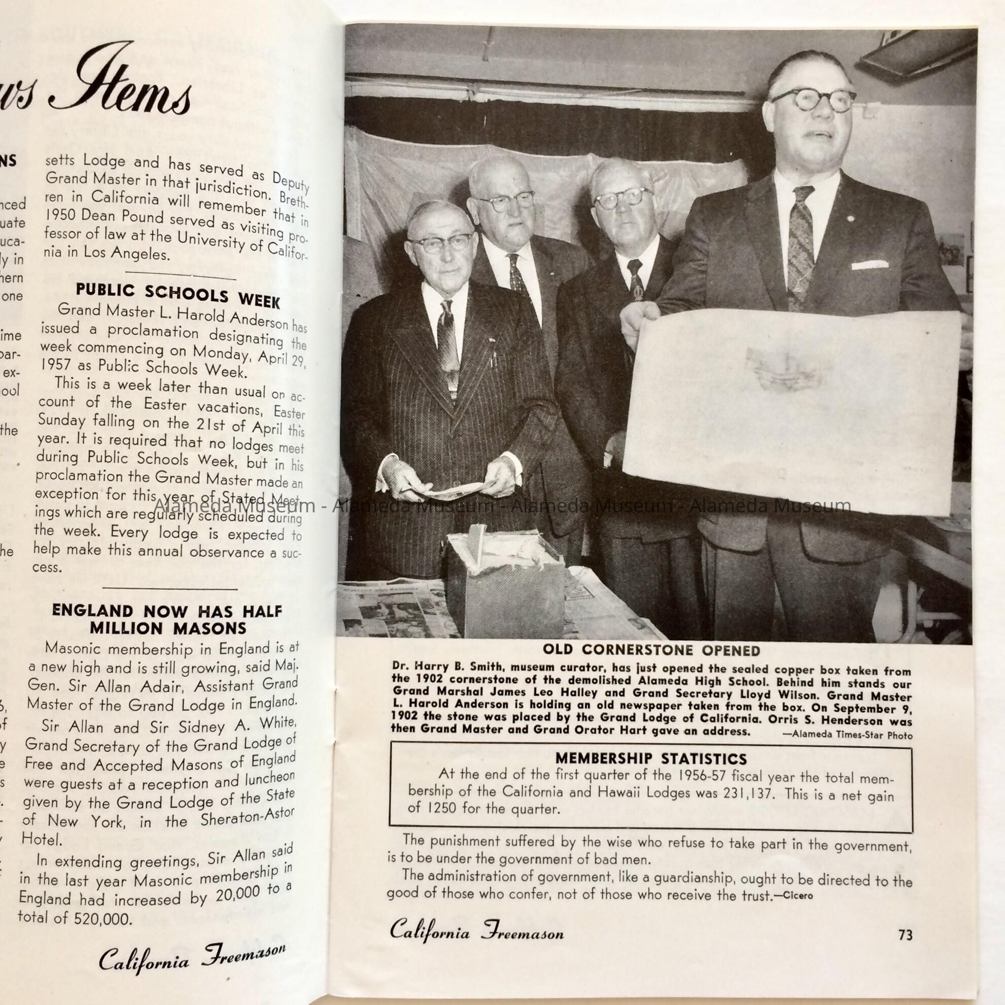 History of Object: Publication entitled "California Free-Mason", Spring 1957. On page 73 is an illustration which includes Dr. Harry B. Smith, Curator of the Alameda Historical Museum during the opening of the cornerstone box of the Alameda High School. The illustration also includes Grand Masters of the Masonic Lodge. The Masonic Lodge presided at the cornerstone dedication of the old High School in 1902.
