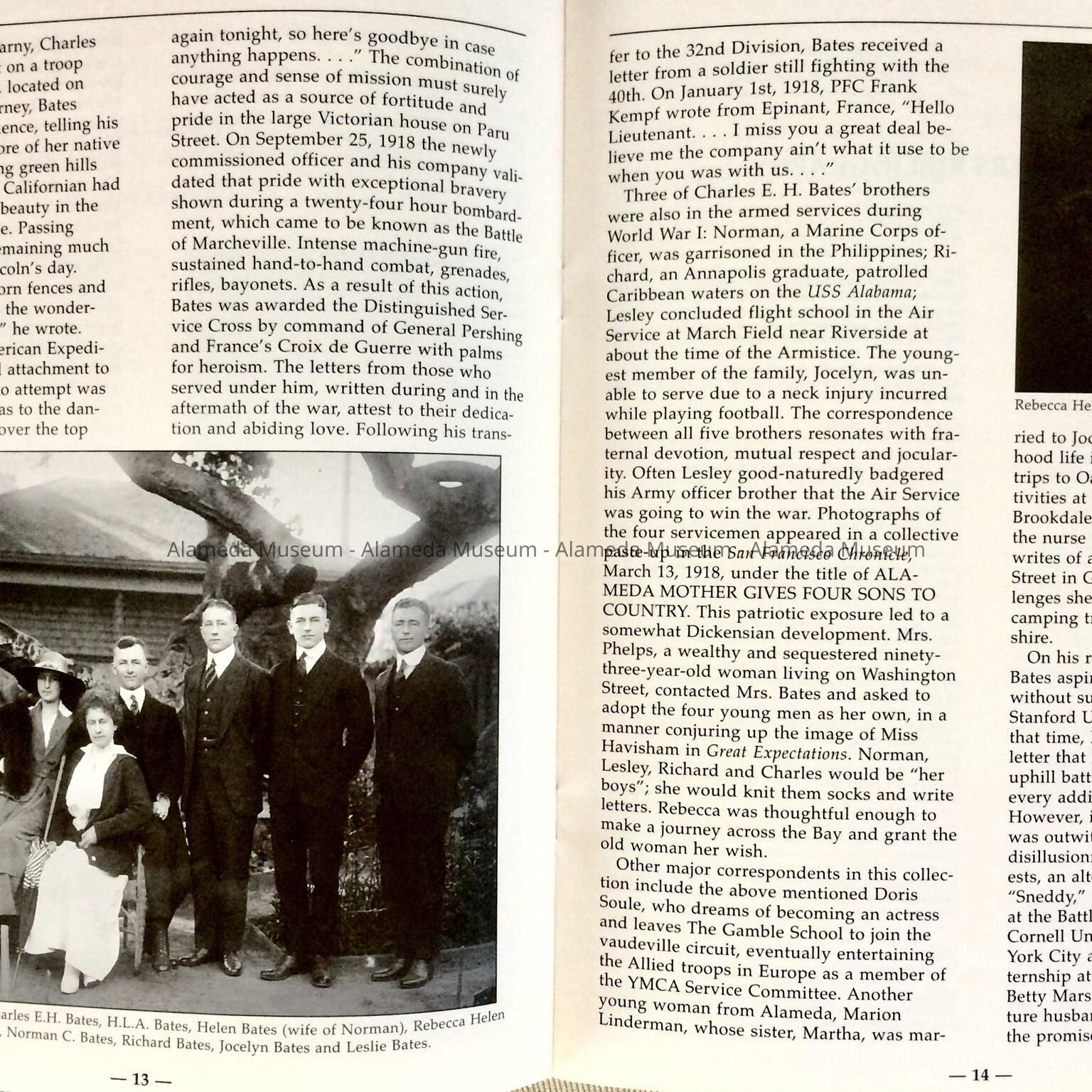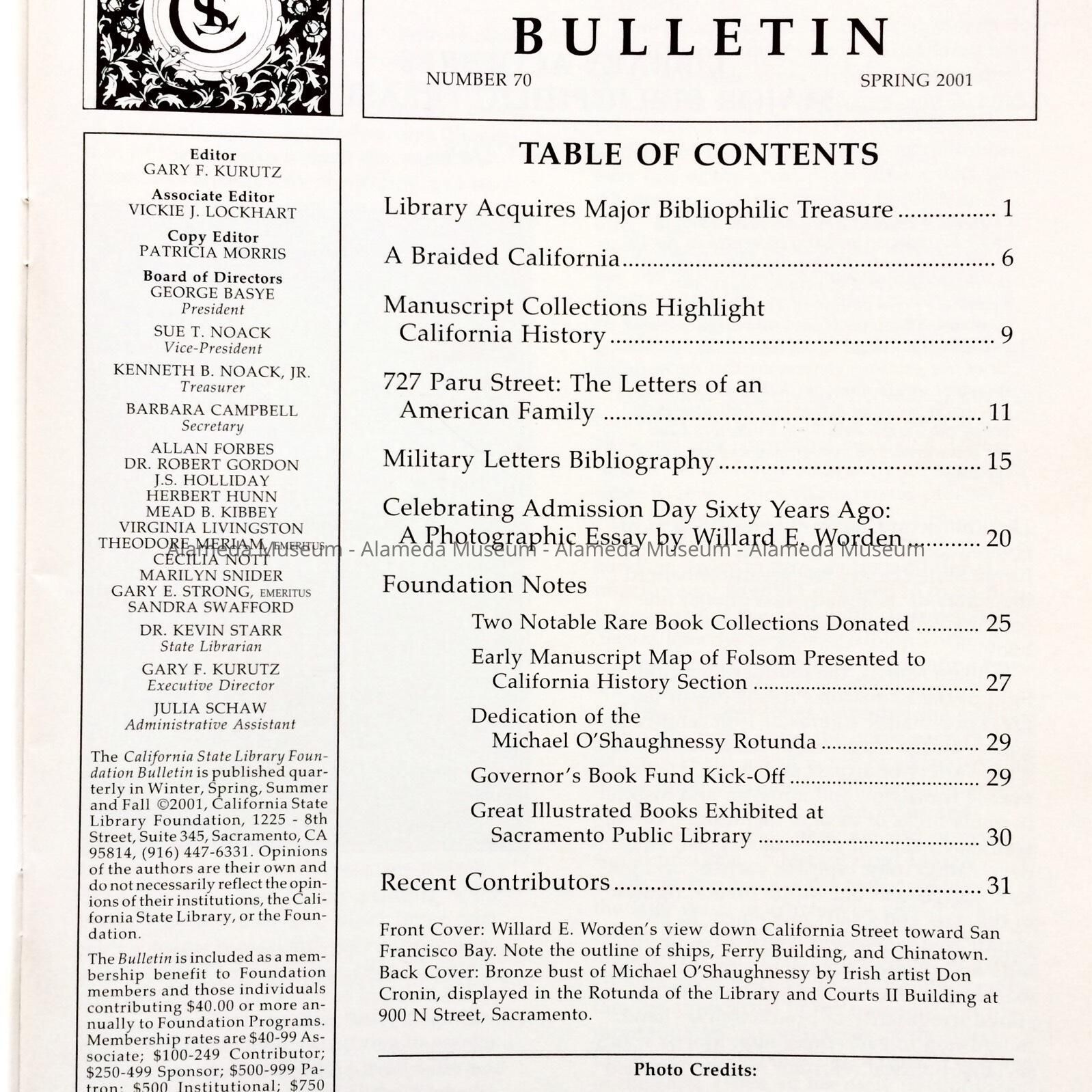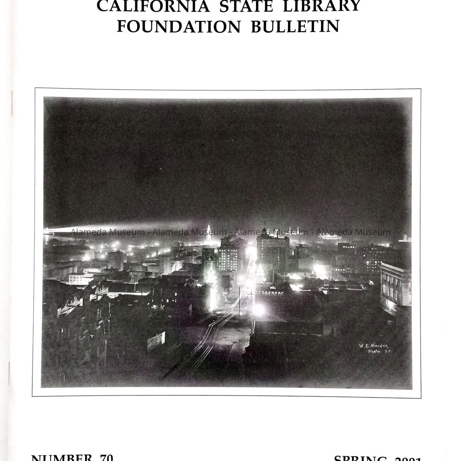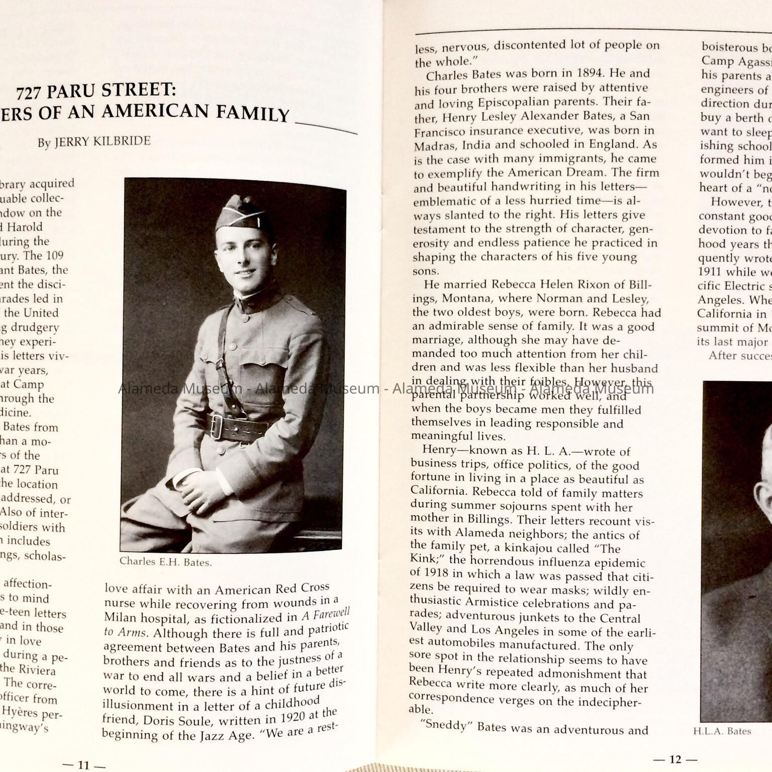 History of Object: The Spring, 2001 issue (#70) of the California State Bulletin. There is an article on page 11 concerning the Bates Family of 727 Paru St., Alameda. The letters and documents of Charles E. H. Bates is part of the California State Library collection and these articles make references to Alameda.