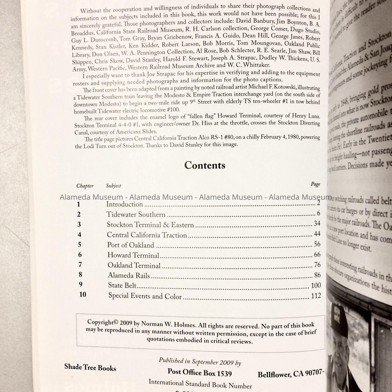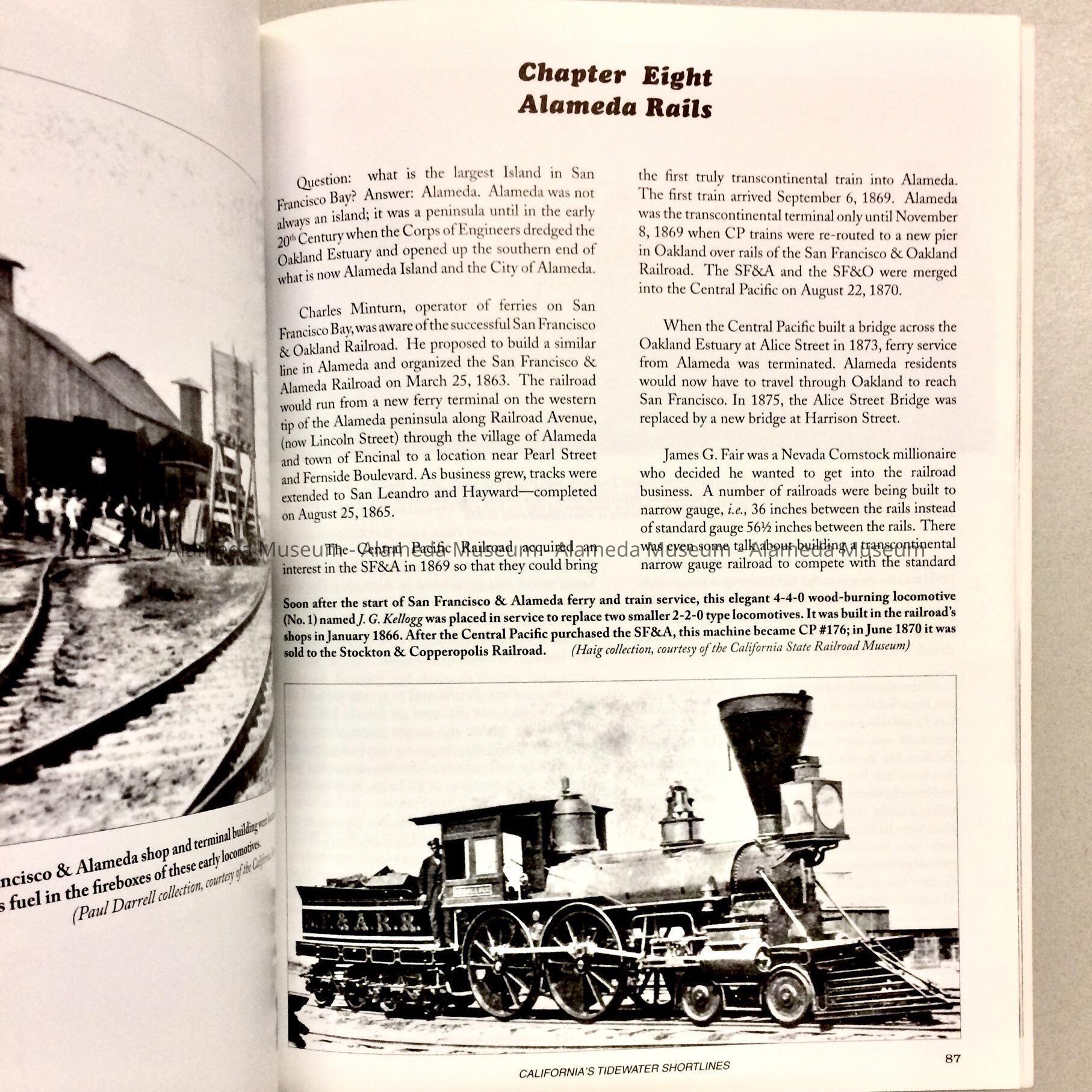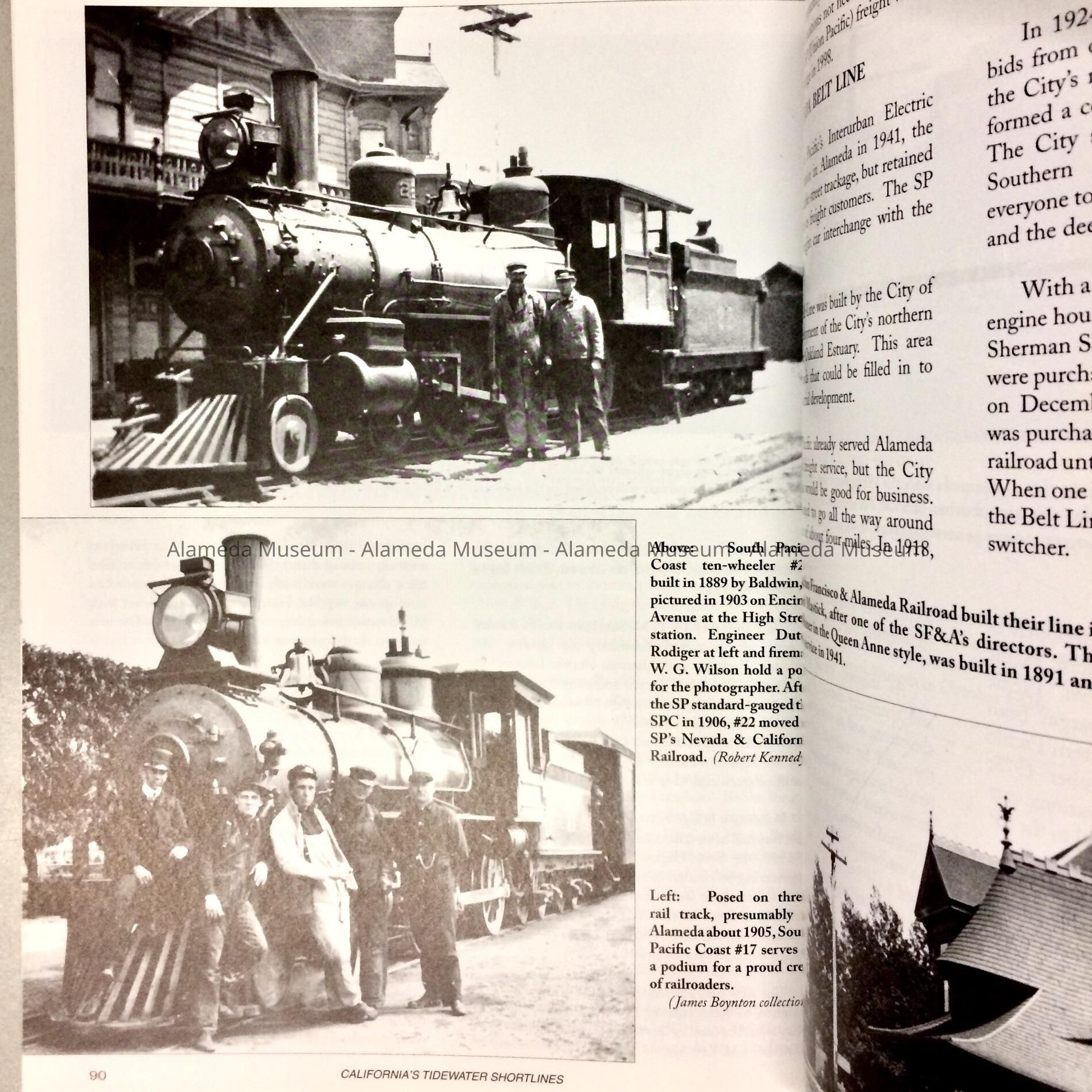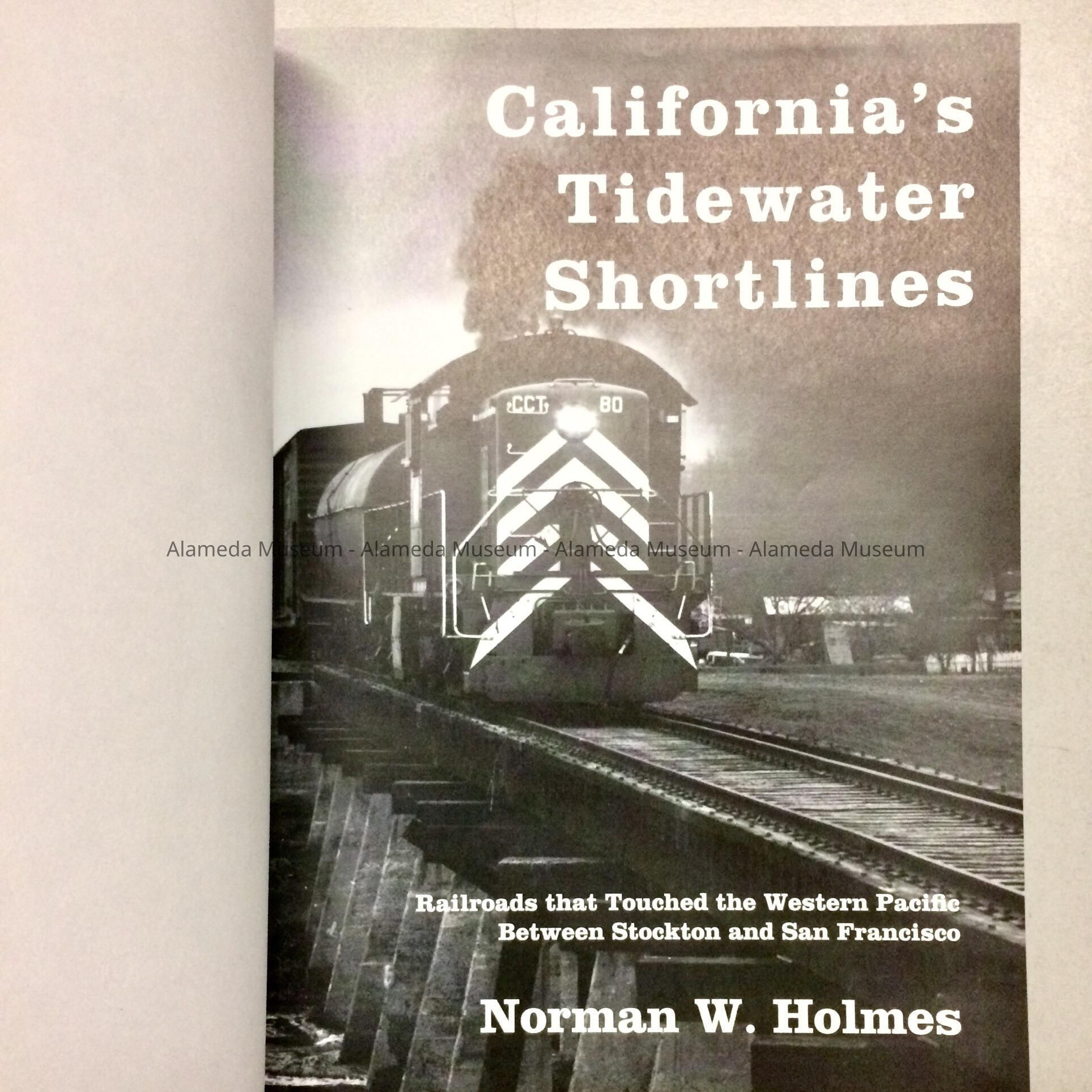 HISTORY OF OBJECT: A REFERENCE BOOK TITLED, "CALIFORNIA'S TIDEWATER SHORTLINES" BY NORMAN W. HOLMES. CHAPTER 8 INCLUDES A HISTORY OF THE STEAM TRAINS AND BELTLINE IN ALAMEDA, CA. THE BOOK IS ALSO ILLUSTRATED WITH HISTORICAL PHOTOS.