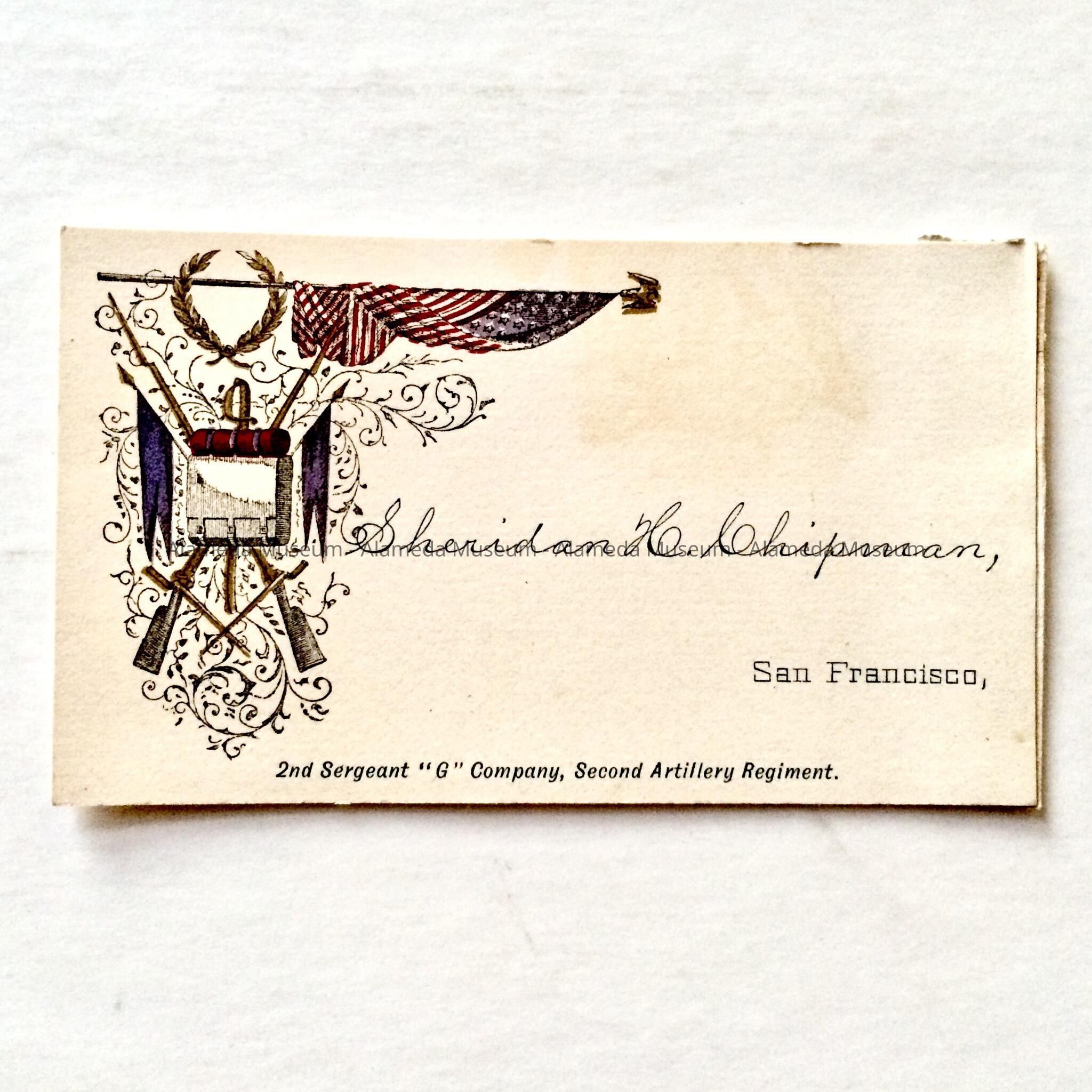 History of Object: Calling card of Sheridan H. Chipman, 2nd Sergeant, G Company, 2nd Artillery Regiment, San Francisco. He was the son of William W. Chipman, co-founder of the City of Alameda.