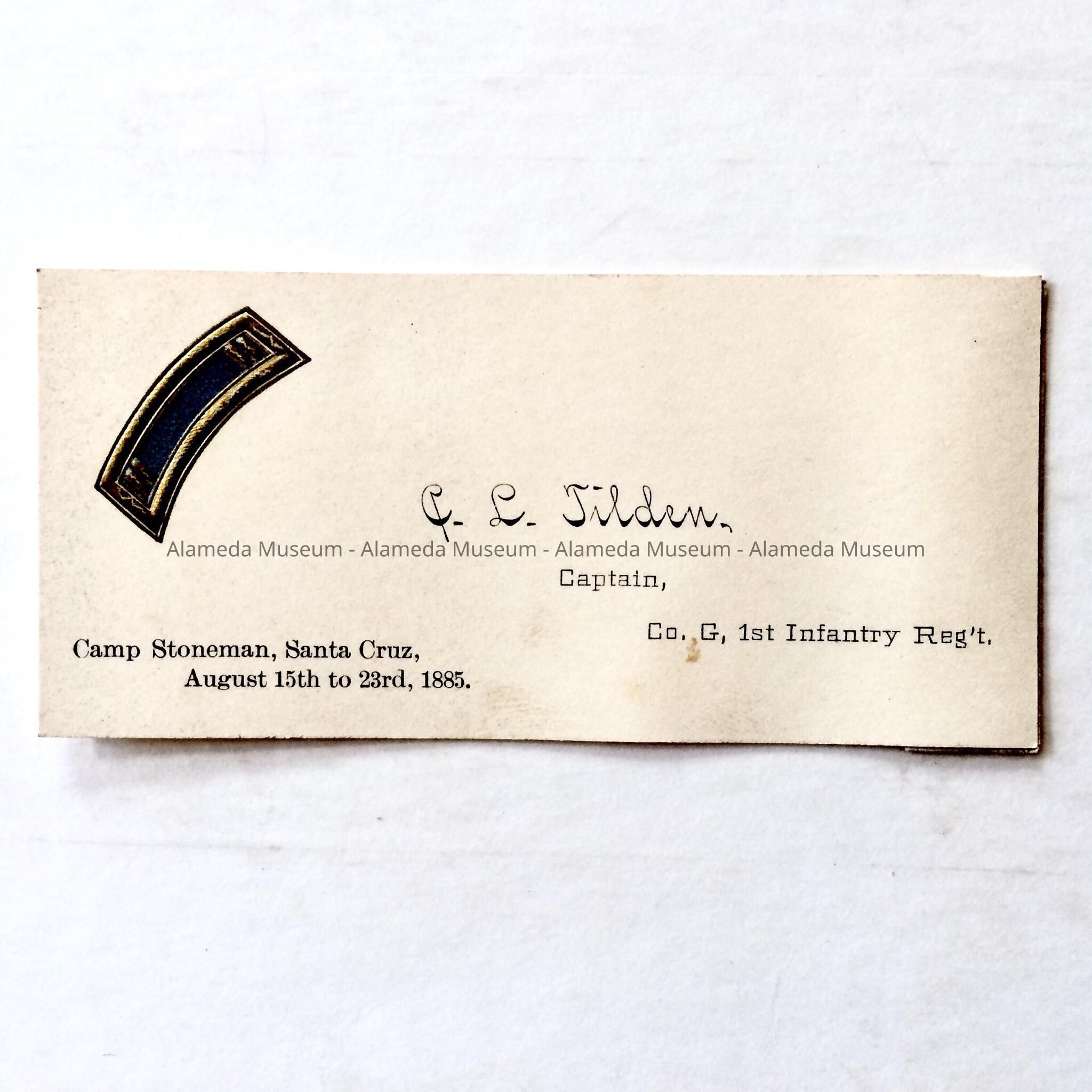 History of Object: Calling card of Charles Lee Tilden, capt., Co. G, 1st Infantry Regiment. The Late Charles Tilden was a longtime resident of Alameda.