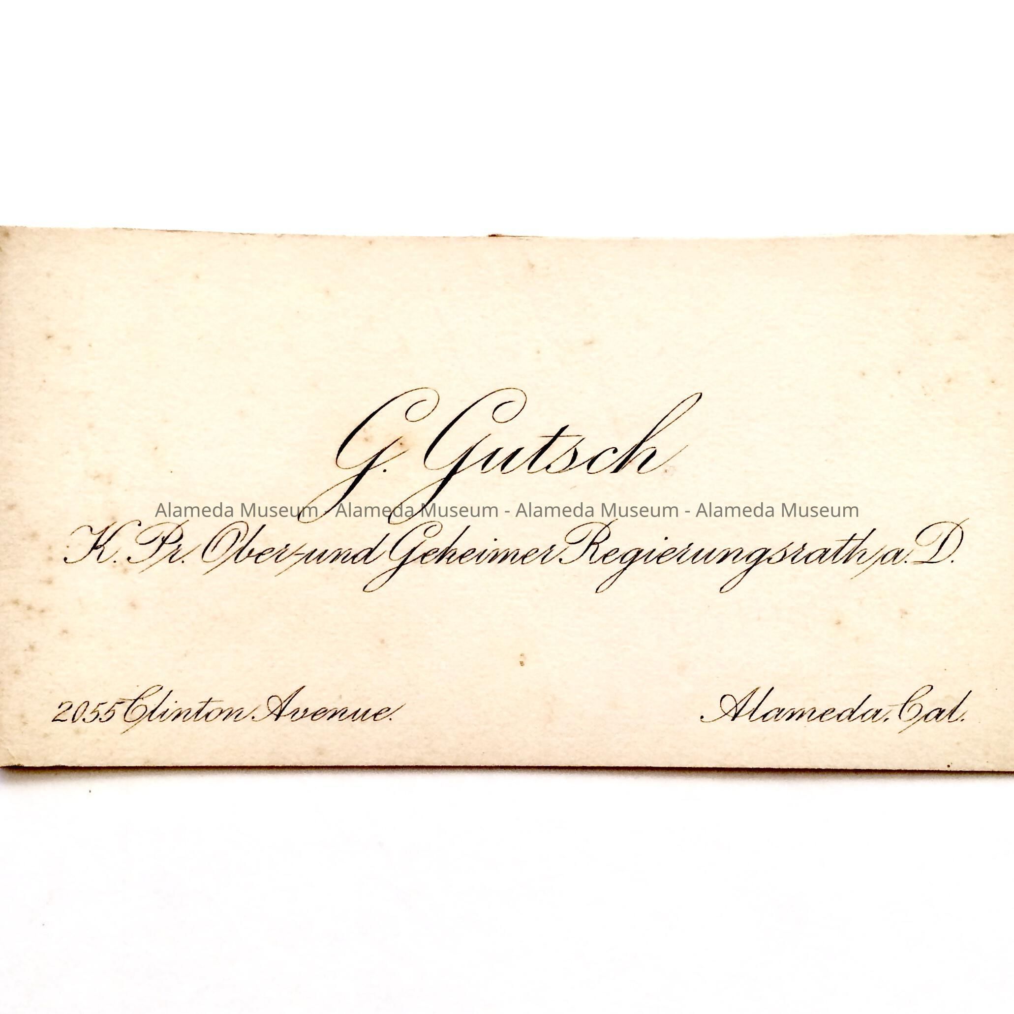 History of Object: Calling card of Gustav Gutsch, San Francisco attorney, and resident of 2055 Clinton Avenue, Alameda.