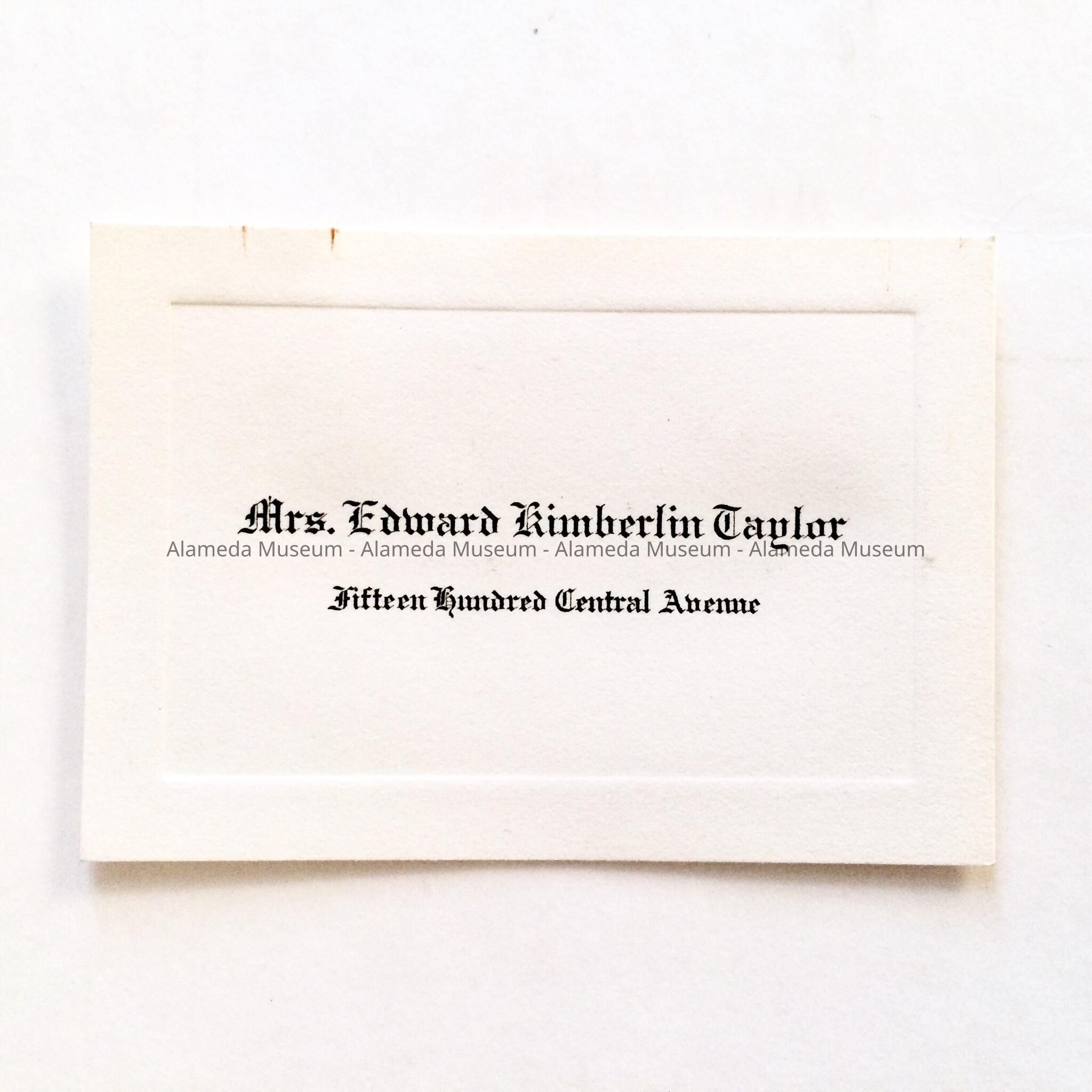 CALLING CARD OF MRS EDWARD KIMBERLIN TAYLOR, WIFE OF E K TAYLOR, FIRST MAYOR OF ALAMEDA, 1500 CENTRAL AVENUE, ALAMEDA, CALIFORNIA.