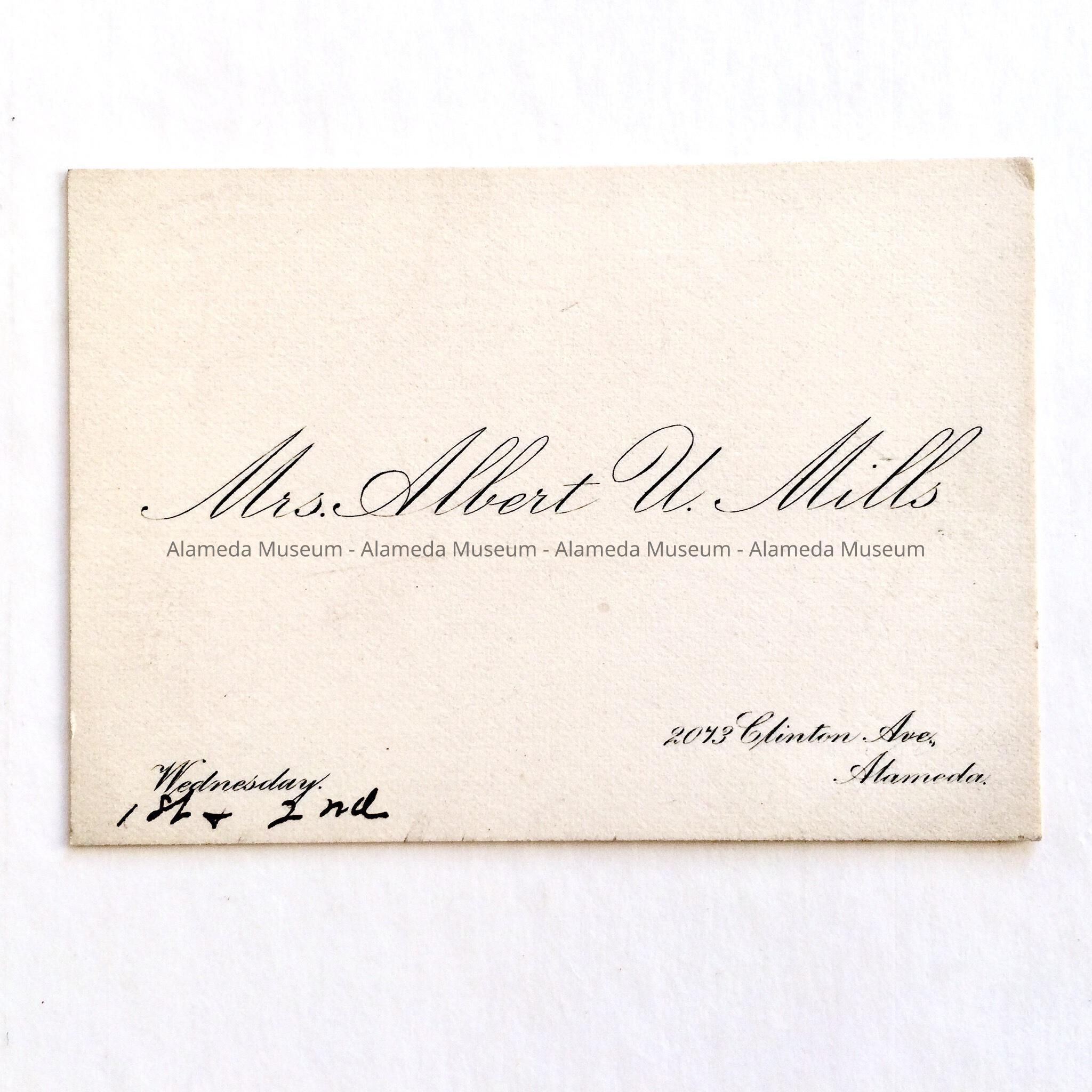 History of Object: Calling card of Mrs. Albert U. Mills, 2073 Clinton Ave., Alameda.
