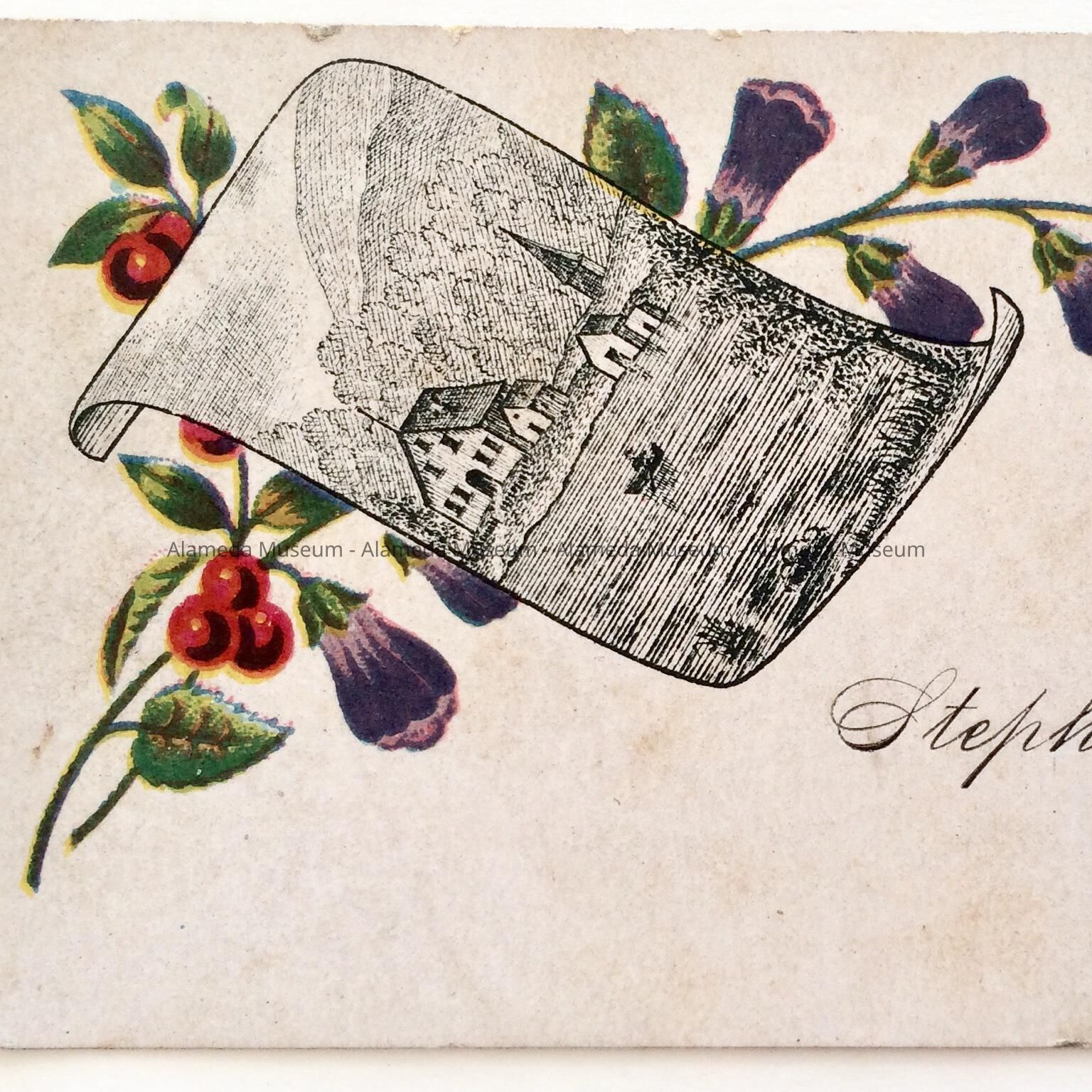 CHROMOLITHOGRAPHIC GREETING CARD, INCLUDING INSCRIPTION IN ORNATE BLACK-COLORED TYPE.