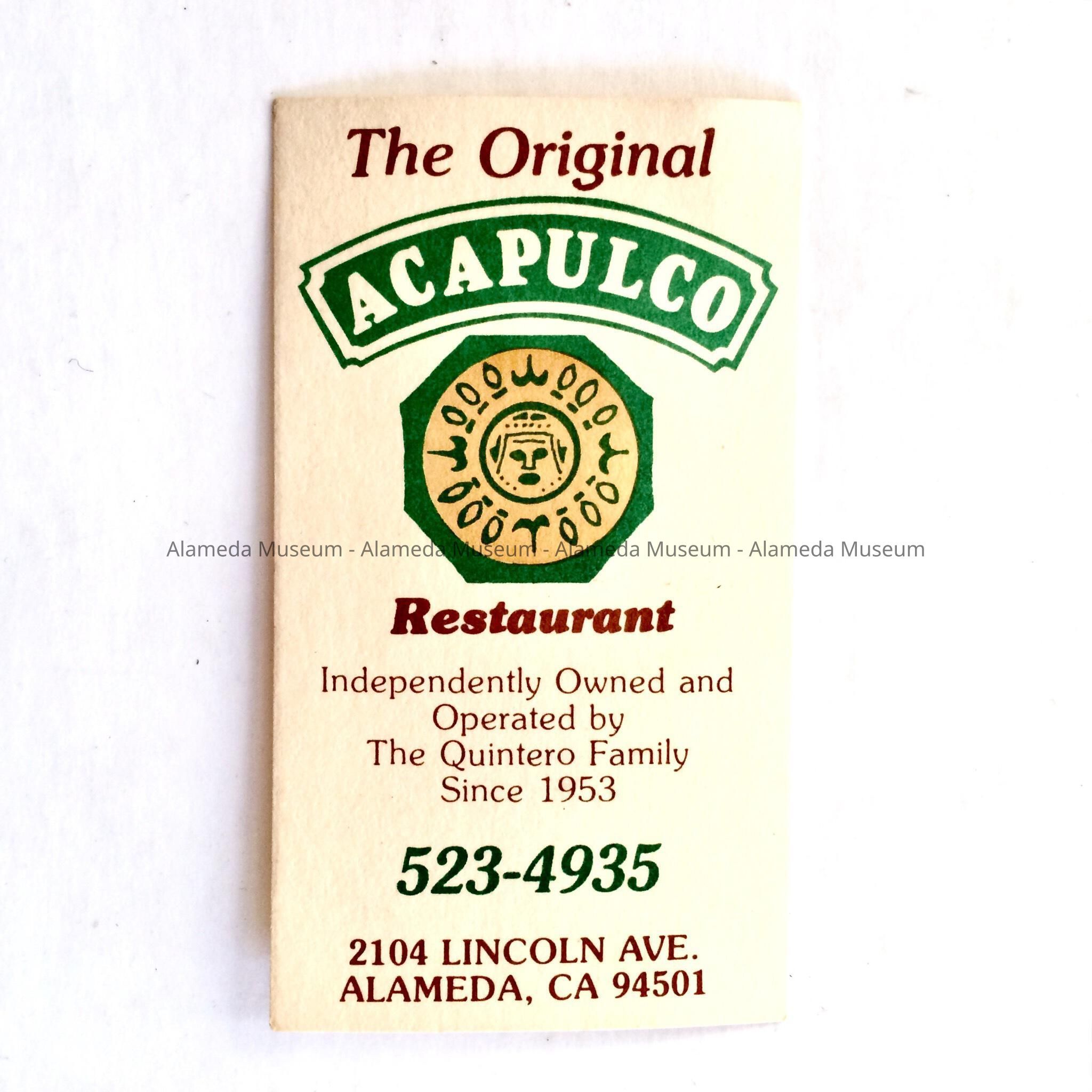 History of Object: Business card from the Original Acapulco restaurant, 2104 Lincoln Ave. The business was opened in 1953 by immigrants Modesto and Rose Quitero, and operated by the family until 2011, after the death of the founders. After a protected closure due to building code changes and permit issues, the restaurant reopened in the same location, operating under the same name, under new ownership.