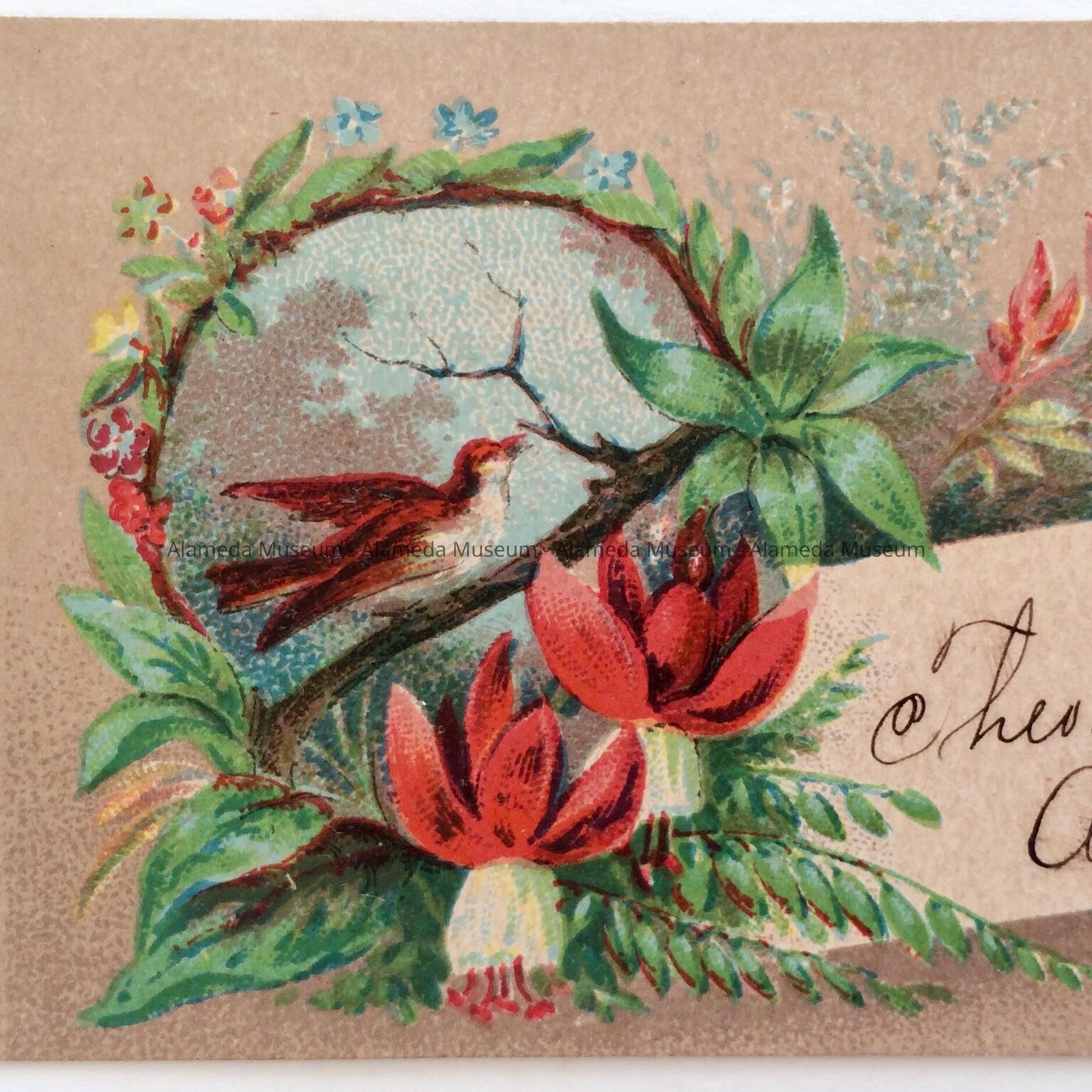 Calling card of Theodore Eisfeldt, depicting bit with fuchsias, 1880Entry/Object ID