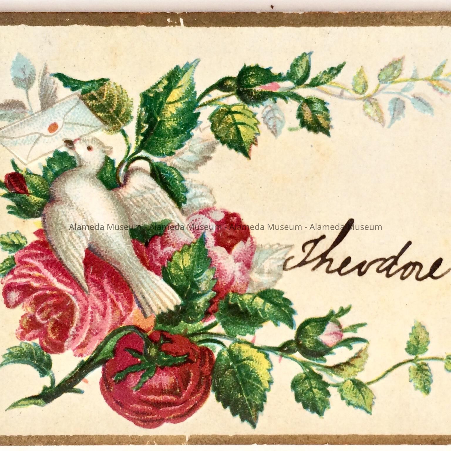 Calling card of Theodore Eisfeldt, depicting dove and roses, c. 1880sEntry/Object ID