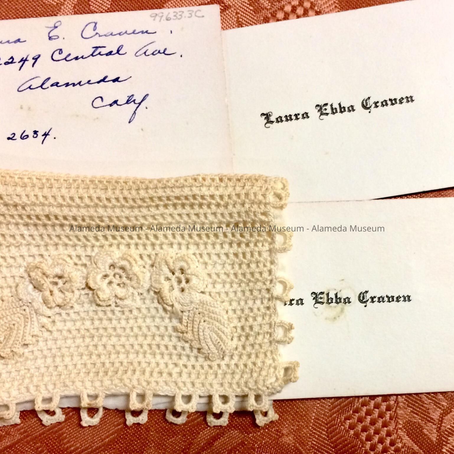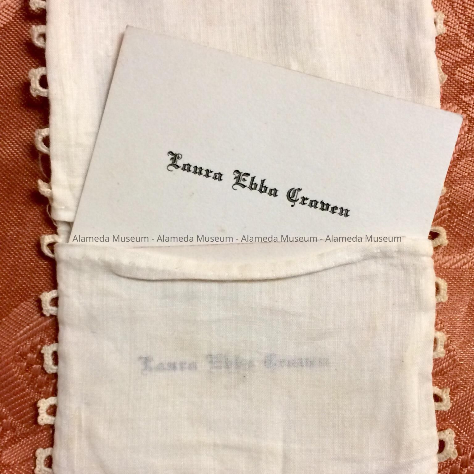 History: Calling cards and case of Laura Ebba Craven, daughter of Major R. G. Craven of 2249 Central Avenue. Laura, later Mrs. Healey, was employed for many years at the Alameda Free Library. The Craven family came here in the 1920's.