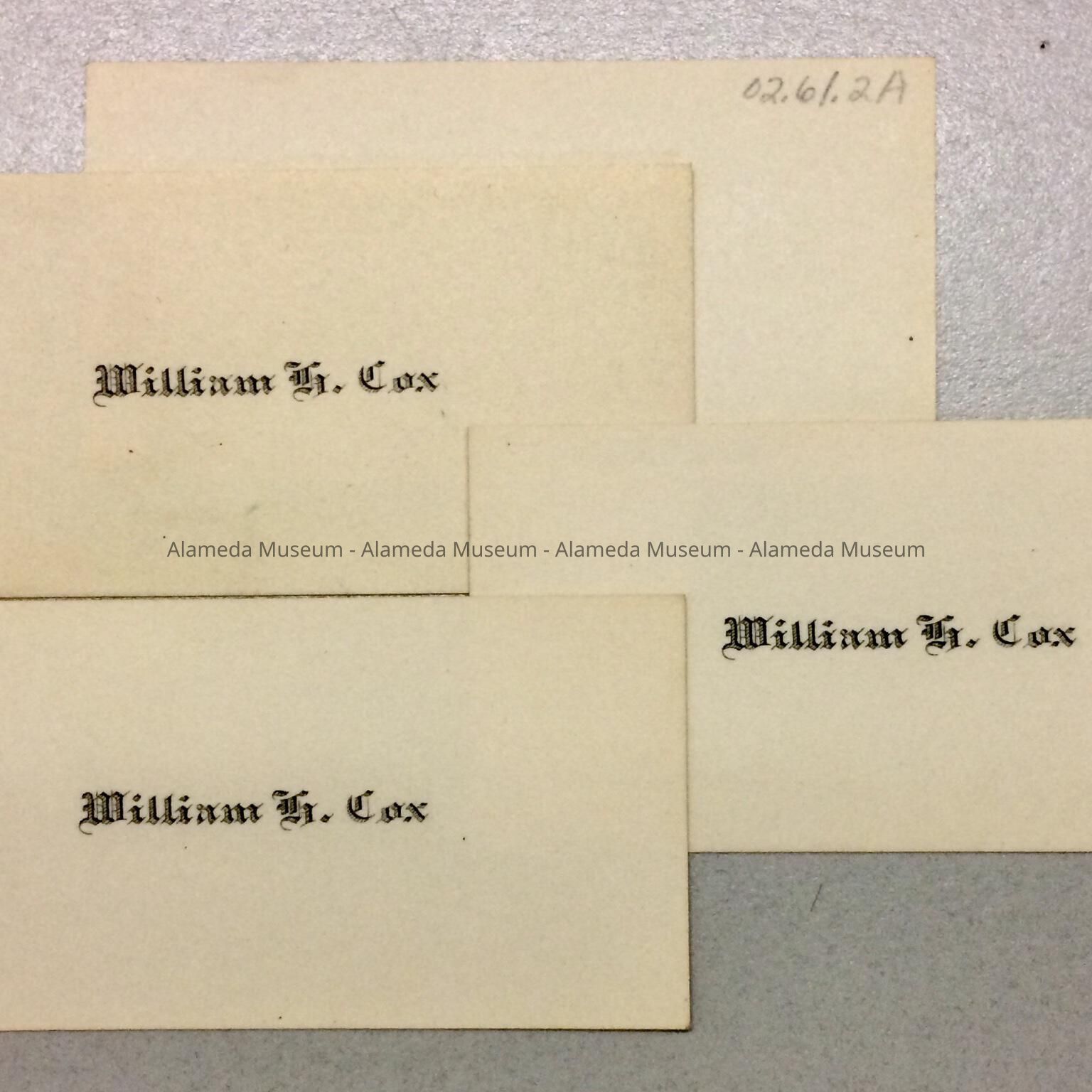 Calling cards of William H. Cox, father-in-law of the late-Adelaide Toye Cox. The Cox family came to Alameda in the early-1900s.