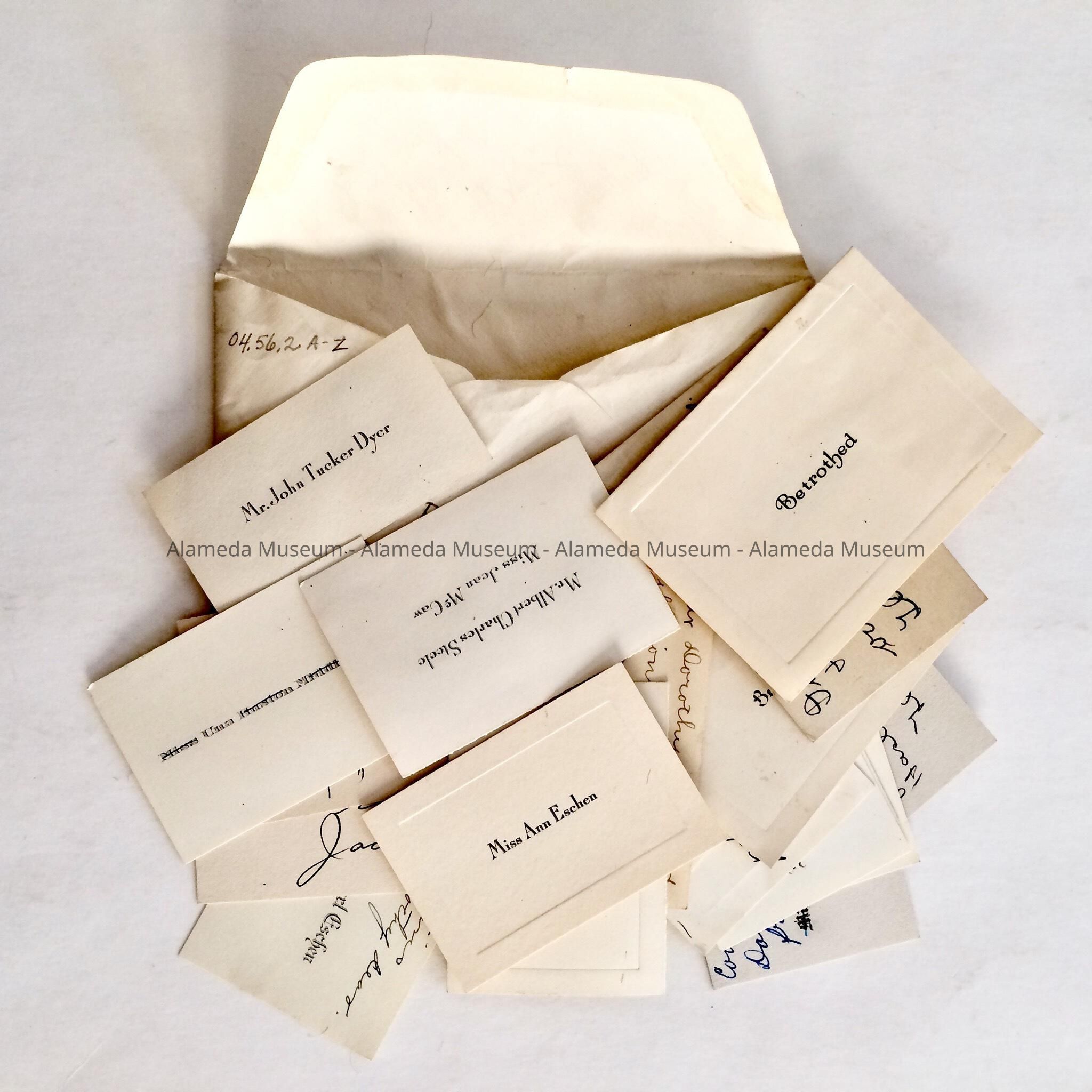 HISTORY OF OBJECTS: CALLING CARDS RECEIVED BY THE LATE DOROTHY DYER. SOME CARDS OFFER CONGRATULATIONS TO HER ON HER WEDDING. SOME CARDS CONTAIN NAMES OF PROMINENT CITIZENS OF THE PERIOD.