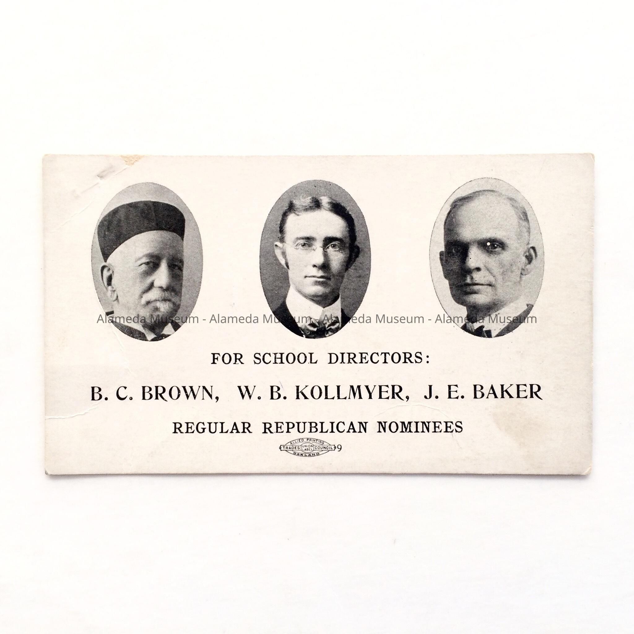 Description: Campaign card illustrated with circular photos of the nominees running for election. Bold heading "B. C. Brown, W. B. Kollmyer, J. E. Baker, for School Directors." On the reverse side is a printed list of precincts and poll locations.