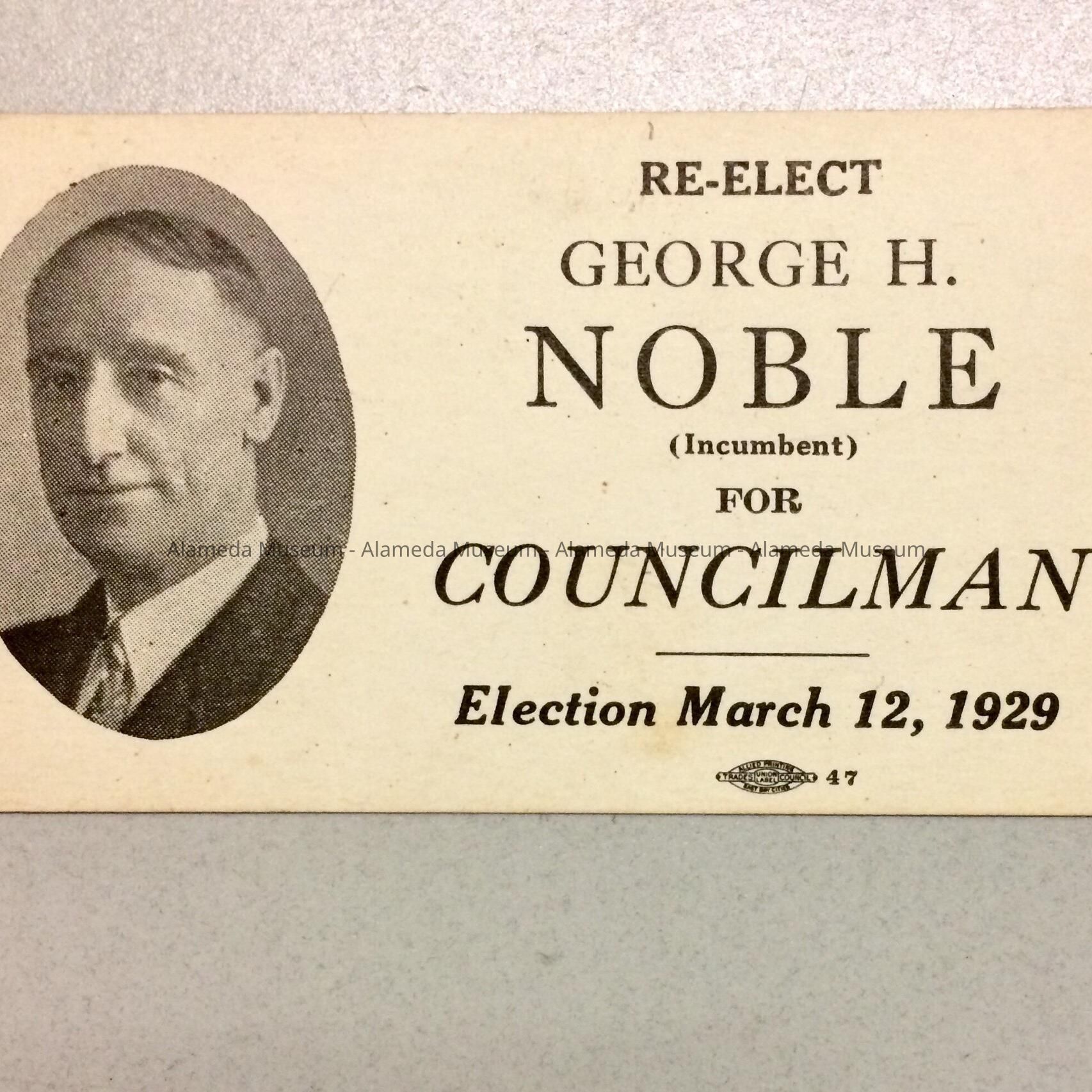 A CAMPAIGN CARD OF THE BUILDER AND CONTRACTOR, GEORGE H NOBLE, FOR REELECTION TO COUNCILMAN FOR THE ELECTION ON MARCH 12, 1929.