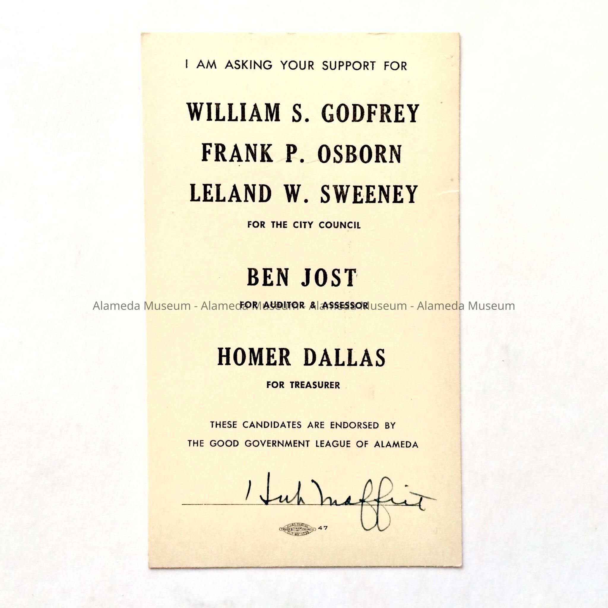 History of Object: Post card (campaign), with the names, Wm. S. Godfrey, Frank P. Osborn, & Leland W. Sweeney, running for City Council, Ben Jost, for auditor & assessor, and Homer Dallas, for treasurer, all candidates for public office in the election of 1953.