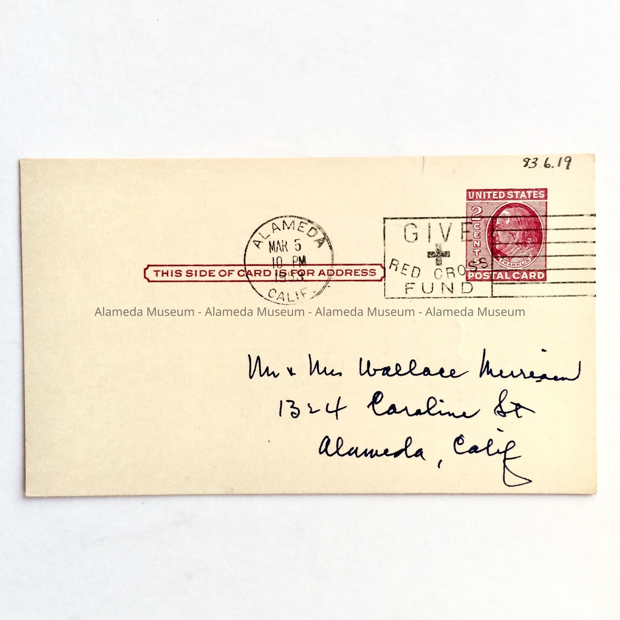 Description: Campaign postcard with list of candidates, reverse side mailing address. Post marked Mar 5, 1953.