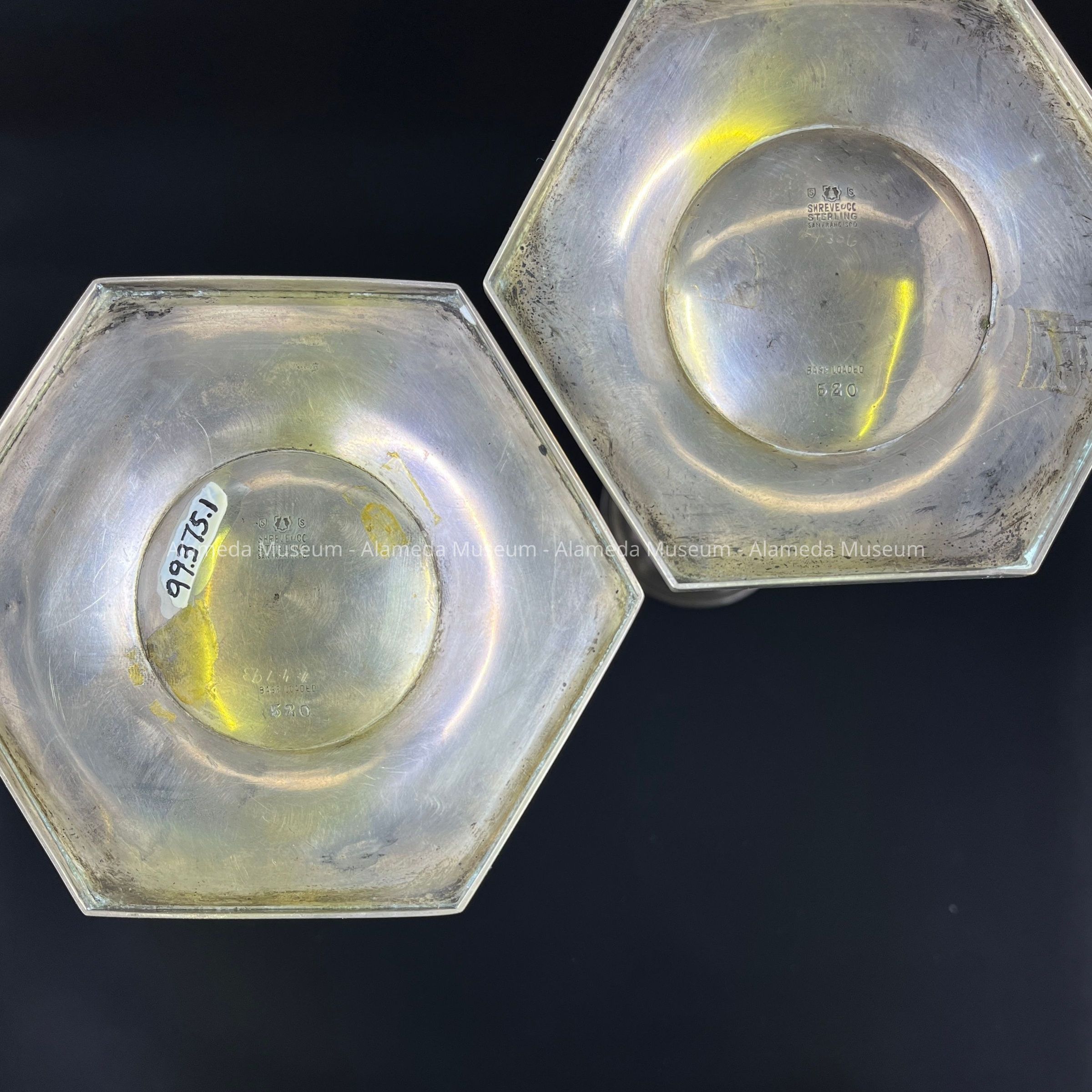 - impressed bell with six-sided shape behind, with on either side letter S in a shield. Under this, text 'SHREVE & Co / STERLING / SAN FRANCISCO'. Additional marks: 'BASE LOADED /